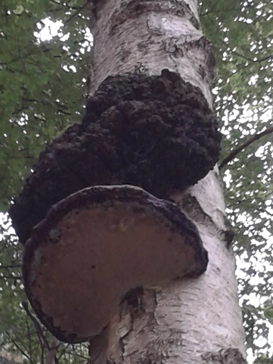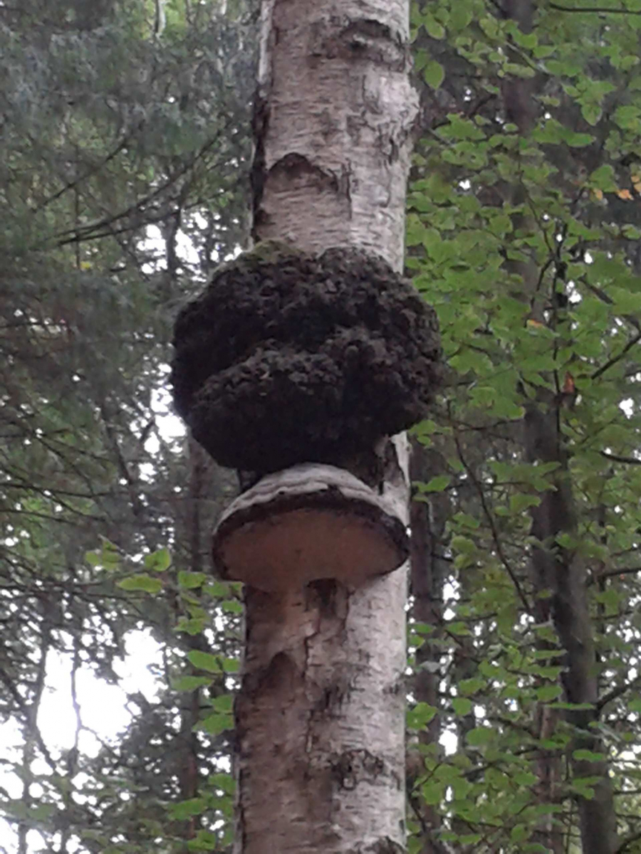 An einer toten Birke (Durchmesser ca. 30-40 cm) hab' ich über einem riesigen Zunderschwamm ein noch viel riesigeres Exemplar eines Baumpilzes entdeckt. Leider wuchs beides in ca. vier Metern Höhe, so daß ich den Pilz (ich nehme zumindest an, daß es ein Pilz ist) nicht vernünftig fotografieren konnte - der Zoom meiner Handykamera bringt eine massive Unschärfe mit sich. Aber vielleicht schließt sich jemand meiner Vermutung an, daß es sich hier um den schiefen Schillerporling handeln könnte, den ich schon seit langem (vergeblich) suche?