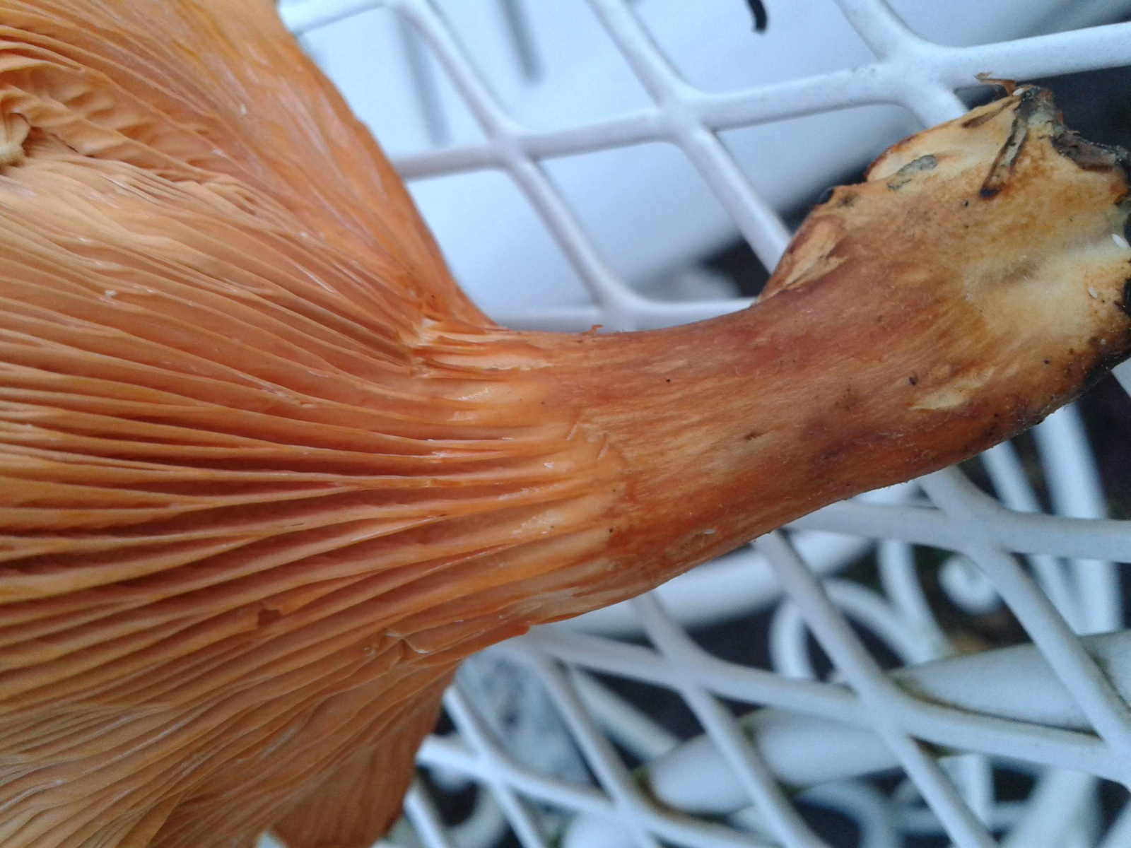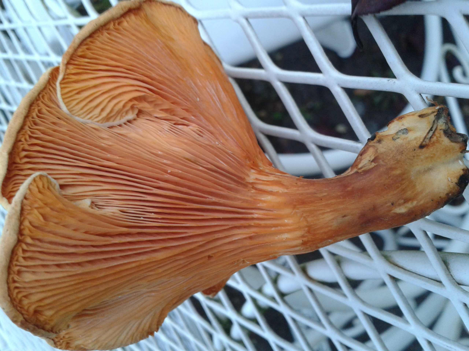 falsche Pfifferlinge sind mit zu Tausenden begegnet in den letzten Wochen (ohne Übertreibung). Aber dieses Exemplar hier stellt mich jetzt doch irgendwie vor Probleme. Ein stattlicher Pilz, gefunden inmitten einer großen Anzahl von definitiv falschen Pfifferlingen, aber halt gut doppelt so groß wie die anderen, in einer relativ lichtabgeschatteten Fichtenschonung auf saurem Boden im Perlacher Forst bei München. Hutdurchmesser knapp 10 cm, Geruch tatsächlich in die mir bekannte Pfifferlings-Duftnote tendierend ( mit leichter Pfeffernote), natürlich keine Milch, keine grünenden Zonen... und keine Verfärbung im Schnitt. Den Rest sollten die Bilder beschreiben. Von den "normalen" falschen Pfifferlingen unterscheidet sich dieser Kamerad erheblich, allein schon durch die fehlende sichere Trennung des Fruchtkörpers in Hut und Stiel. Trotzdem sind das eindeutig Lamellen und keine Leisten. - Hmpf, was meint Ihr dazu? Ist das gaaanz was anderes?? Über eine Lösung des Rätsels würde ich mich freuen!