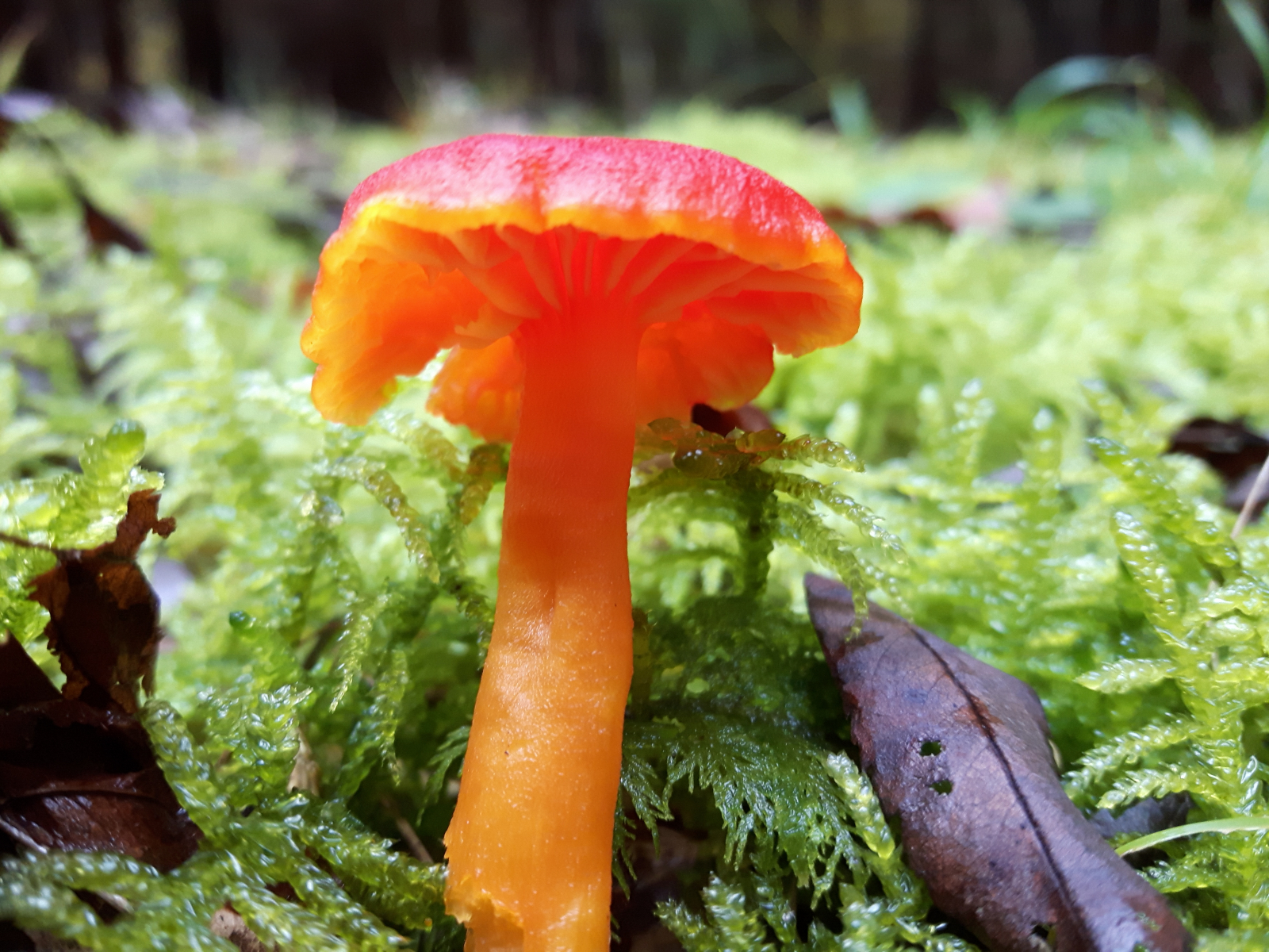 - die gibt's wie Sand am Meer zur Zeit:Zu guter Letzt: Ein knallrotes Exemplar, das ich nicht zuordnen konnte. Ein Saftling? Ca. drei Zentimeter Durchmesser, im Rudel anzutreffen, auf einer sonnigen Fichtenwaldlichtung. Jedenfalls ein wunderschöner Pilz