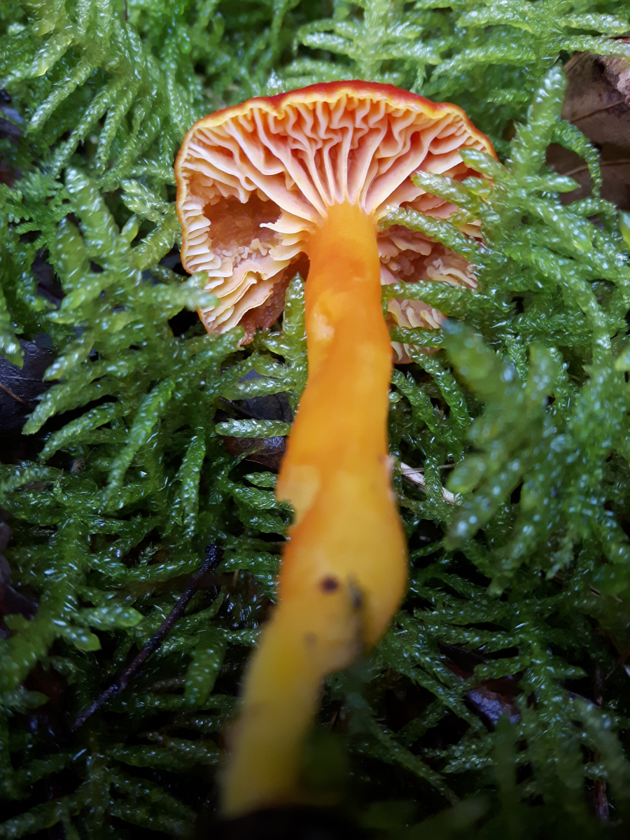 Und danke für den Tip mit dem Kirschroten Saftling - der ist in meinen Büchern tatsächlich nicht vertreten, aber was ich auf Deinen Hinweis hin im Internet gefunden habe, sieht nach 'nem Volltreffer aus, insbesondere auch, was diese etwas körnig strukturierte, "matt-glänzende" Huthaut betrifft. Ich hatte eher an den Honig-Saftling (Hygrocybe reidii) gedacht, aber einen Duft nach Honig hatte ich nicht wahrgenommen. Seltsam war ja vor allem der Fundort mitten im Wald, im Moos einer Lichtung, aber weit weg von jeglicher Wiese - das scheint vor allem zum Kirschroten zu passen.
