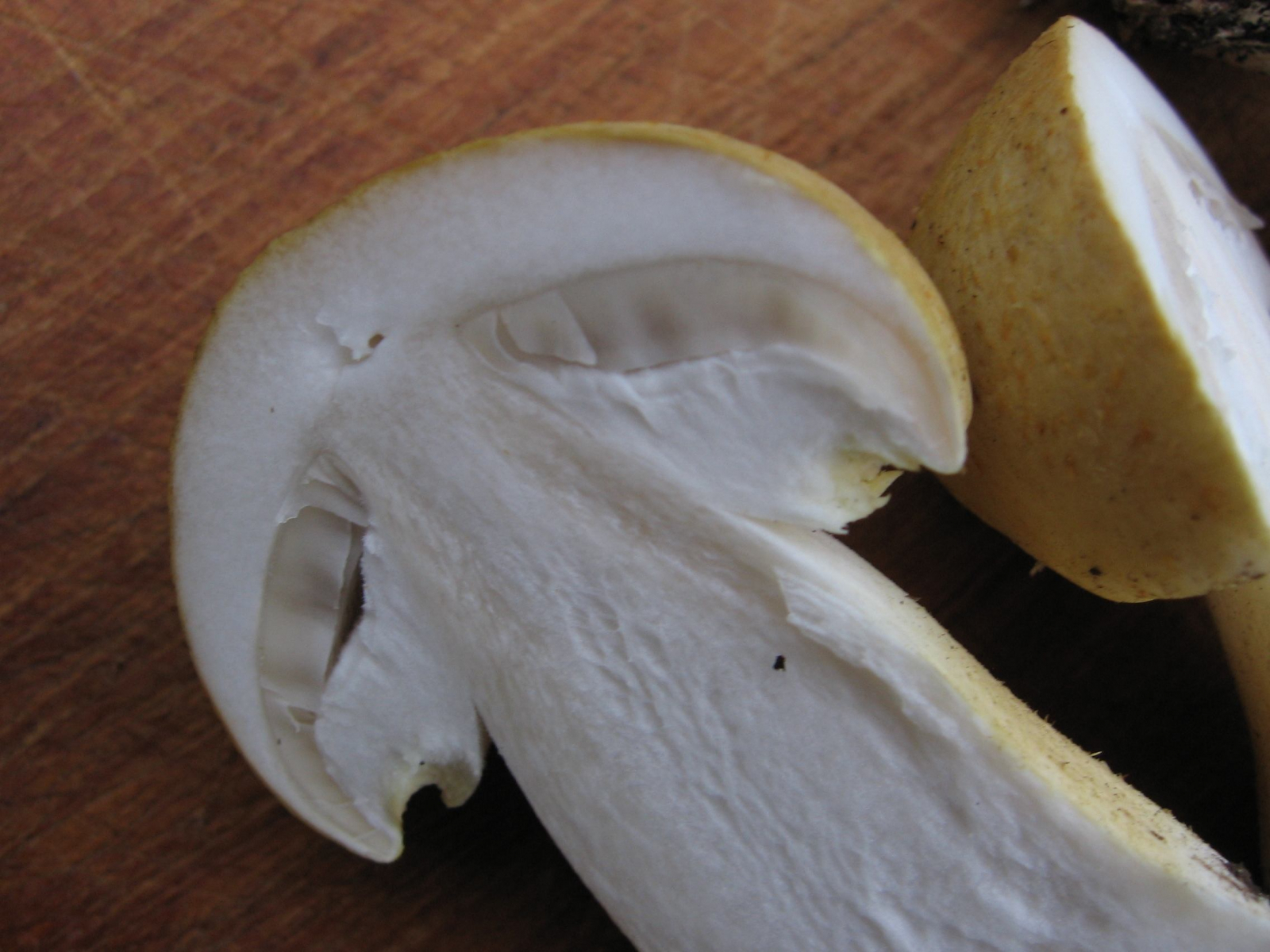 ), daß es sich hier durchwegs um Steinpilze handelt. Sie hatten alle ein weißes Netz an der Stielspitze und auch alle anderen Bestimmungsmerkmale. Die beiden äußeren sehen m.E. aus wie Kiefernsteinpilze, der mittlere wie ein Fichtensteinpilz. Nun das Seltsame: Die beiden großen schlanken, leicht rötlichen Dunklen wuchsen zwischen Fichten, der stämmige kurze Hellbraune in der Mitte eines "Trampelpfads" zwischen Fichten auf der einen und Hainbuchen auf der anderen Seite des Wegs. Was meint Ihr? Gibt es den "Kiefernsteinpilz" auch ohne Kiefer? In meinen Büchern steht zu ihm mehrfach "meist bei Kiefern".
