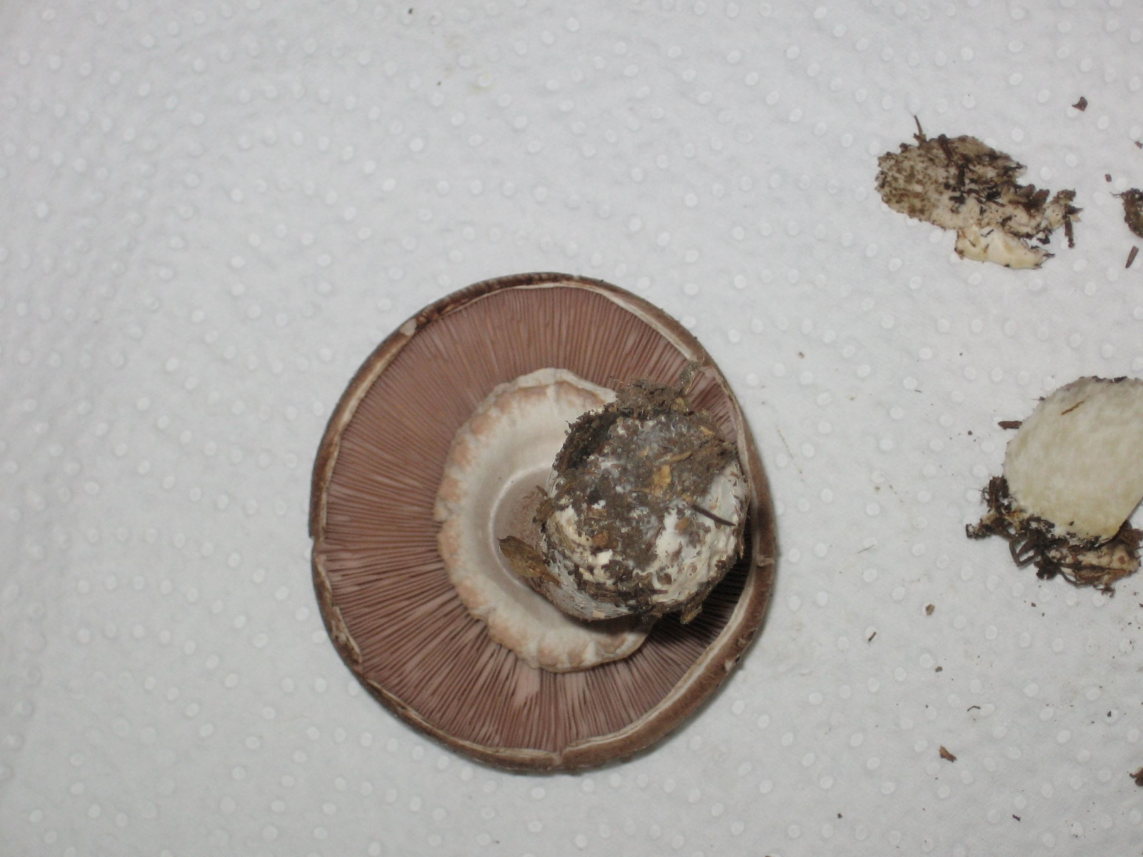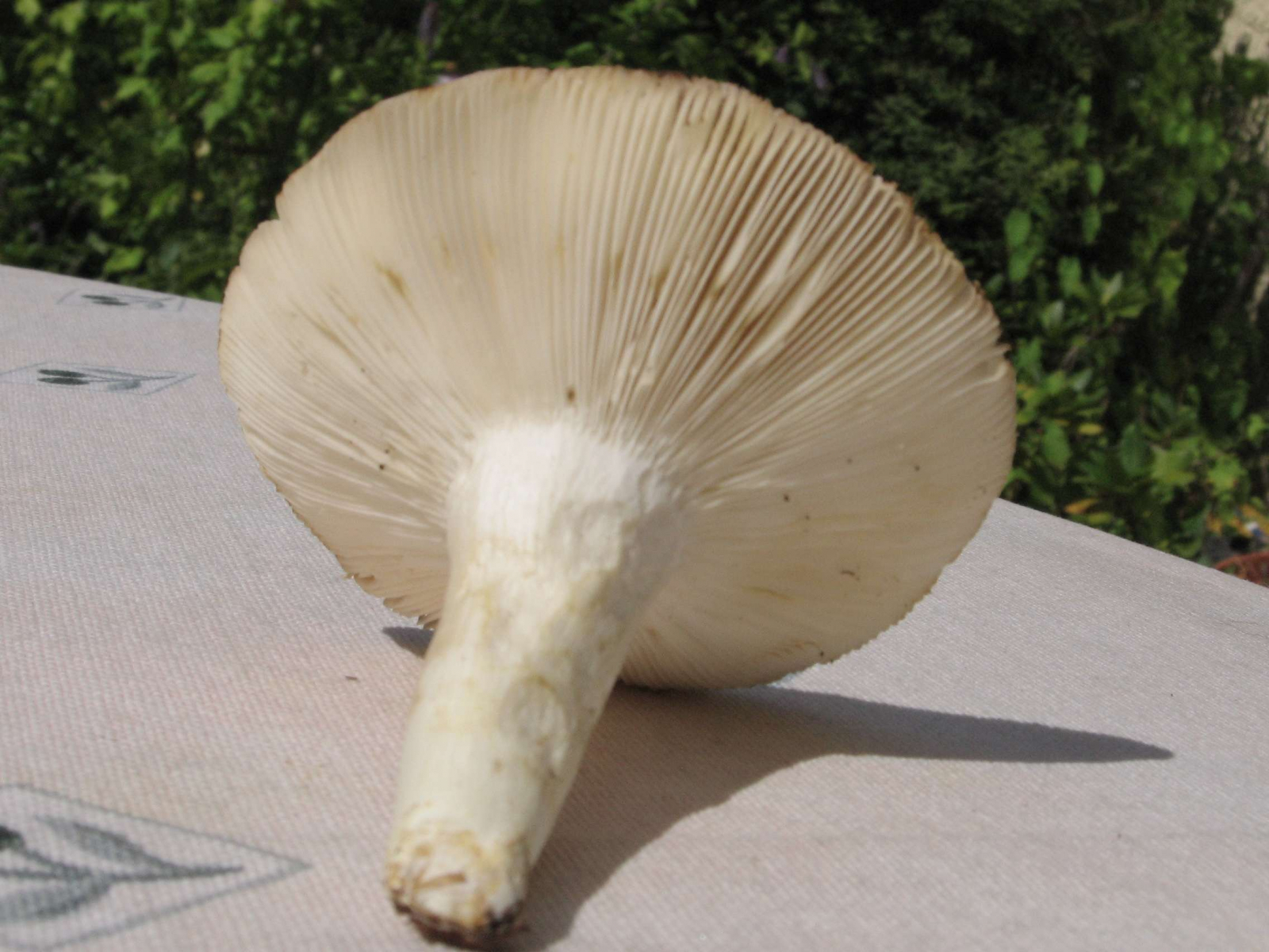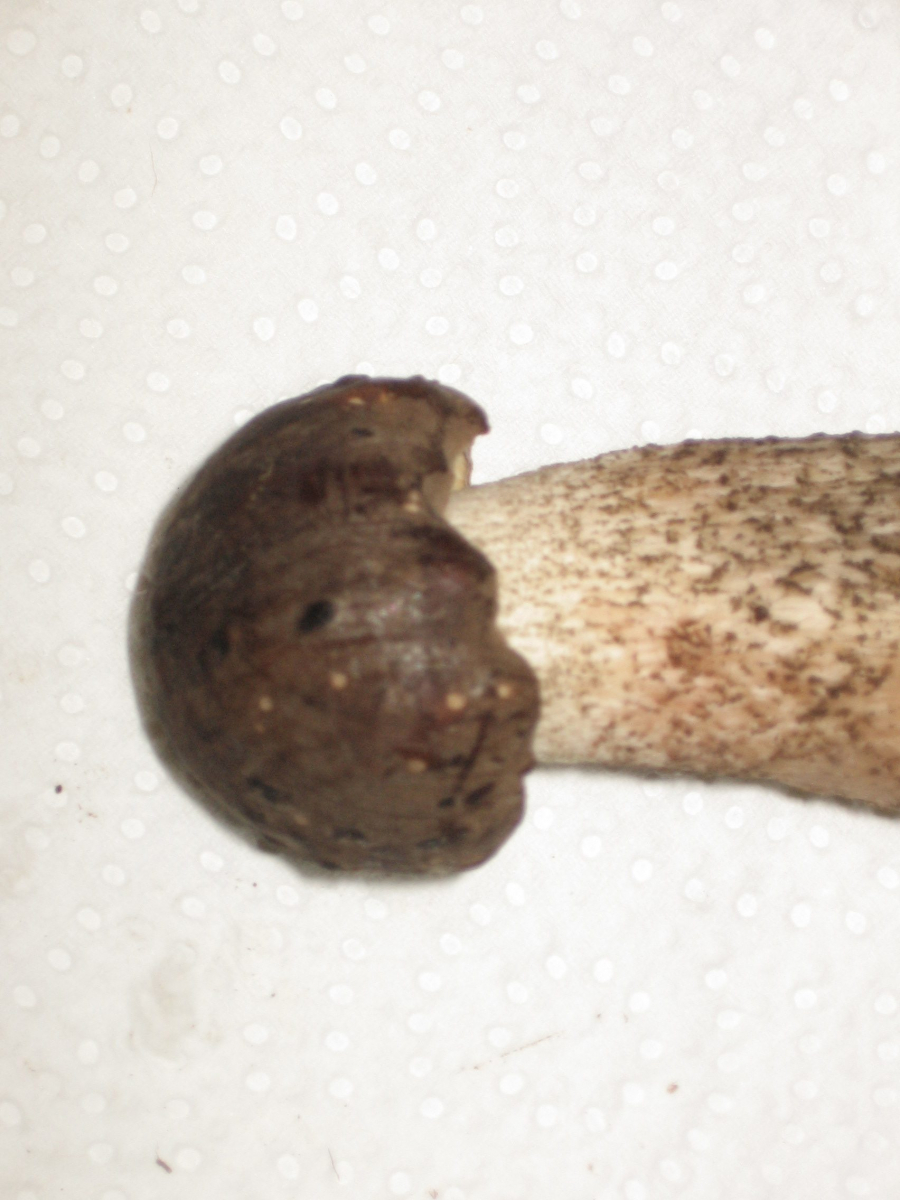 Nach dem folgenden Pilz habe ich aber in meinen Büchern vergeblich gesucht, dabei sieht der sehr individuell aus, wie ich finde: Ein bildschöner Pilz, der feste, glatte Hut ca. 13 cm Duchmesser mit einer Huthaut, die exakt so aussieht wie eine Haselnußschale, samt Maserung. Die Dinger standen in Rudeln auf feuchtem, moosigem Boden, Hauptbäume waren dort Fichten und Hainbuchen. Die Bilder sind erst viele Stunden nach dem "Ernten" gefertigt, aber der hier fast schwarz gefärbte, rissige Hutrand war schon vorher sehr dunkel. Die Lamellen dunkelten ebenfalls noch nach. Ist das ein Rißpilz? Das vermute ich nur wegen des Hutrandes, aber eigentlich habe ich keine Ahnung. Ihr vielleicht? Das wäre schön!
