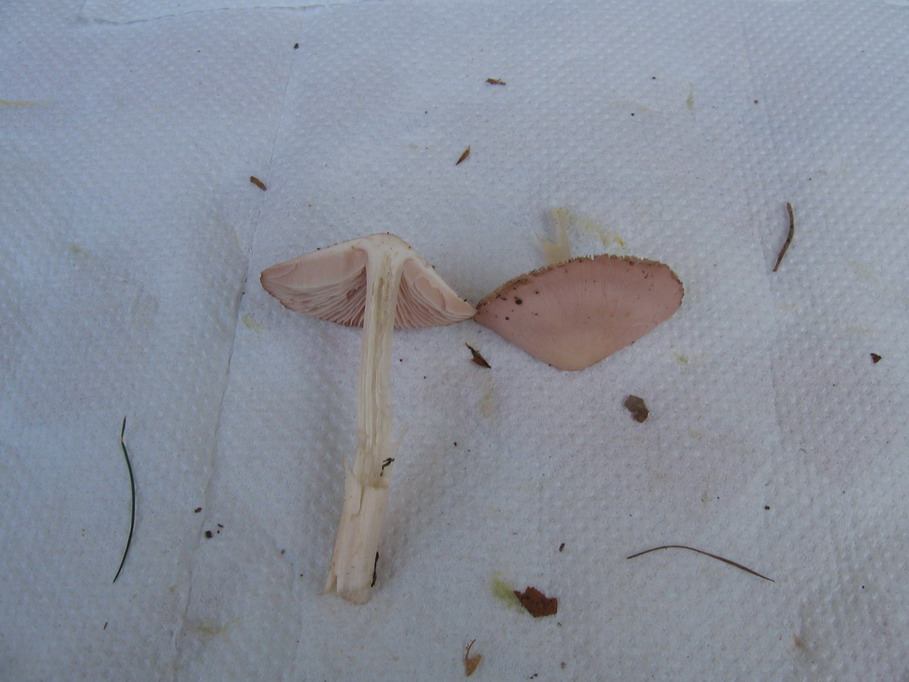 ein ganz zarter rosa Pilz, Hut-Lamellen-Stiel rosa, Fleisch weiss.