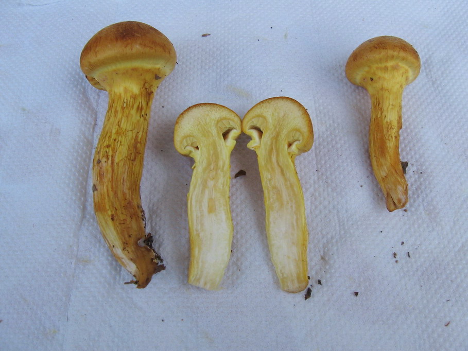 Eine Pilzfamilie in goldigem Glanz, der ganze Pilz ist golggelb, der Hut ist am Stiel geschlossen. Hat Lamellen.