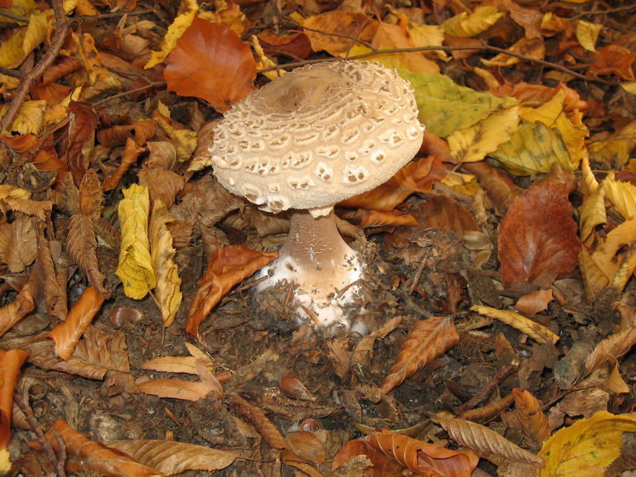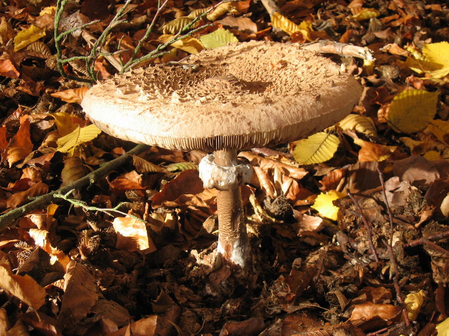 Parasolpilz? Der erste,noch recht jung mit dicker Knolle am Stielende. Der zweite war rieseg, Hut Durchmesser ca. 23cm