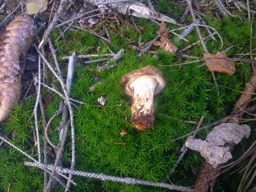 ich halte hier den Kahlen Krempling (paxillus involutus) für möglich, auch wenn die Huthaut sehr braun und filzig ist; es ist ja schließlich ein junges Exemplar und noch nicht verkahlt. Er ist ein Giftpilz > Paxillussyndrom.