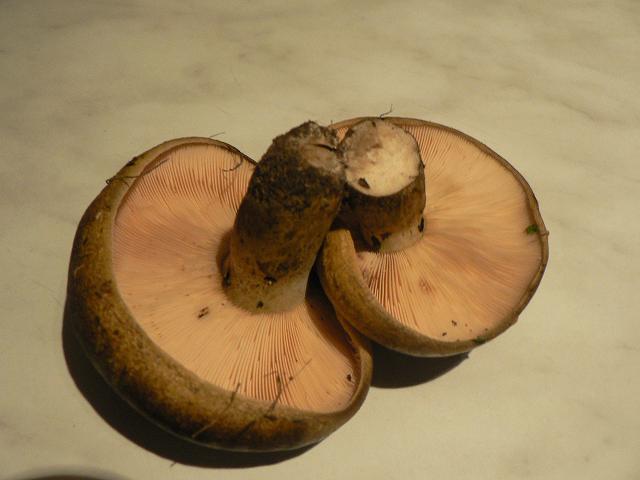 Also die Lamellenfarbe ist in Wirklichkeit weißlicher, nicht so orange, kommt wohl vom Fotoapparat, aber besser hab ich das da auch nicht hinbekommen. Außerdem lag der ja auch schon ne Stunde rum. Und der Hut ist bräunlich. Innendrinnen ist der Pilz ganz weiß. Ich denke schon dass es der Pilz ist den ihr vorgeschlagen habt. Alles würde passen.