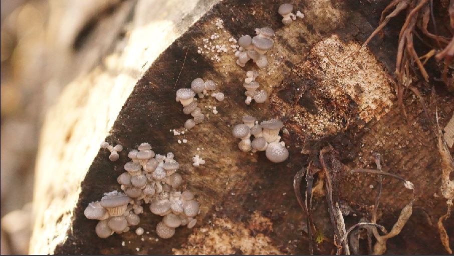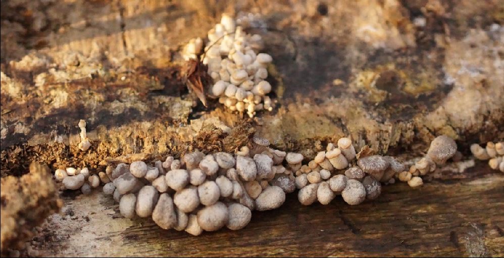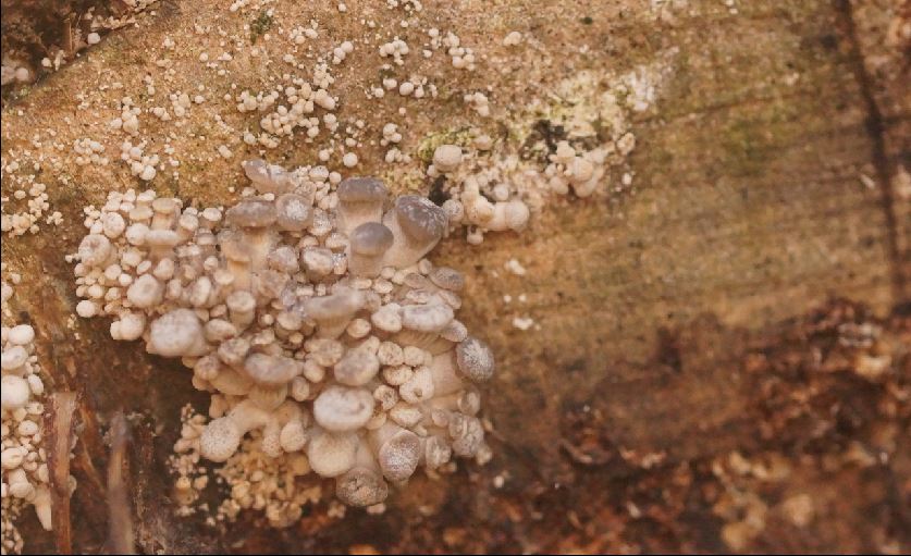 Übrigens war es wieder einmal so, dass der nicht abgedeckte Hut, den ich zum Trocknen wegen des eventuellen Geruchs nicht unter Glas hatte, am bestens ausgesport hat. Spp weiß.5. Substrat (Ast) in Gesamtübersicht, gesellig wachsend
