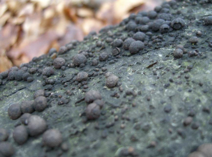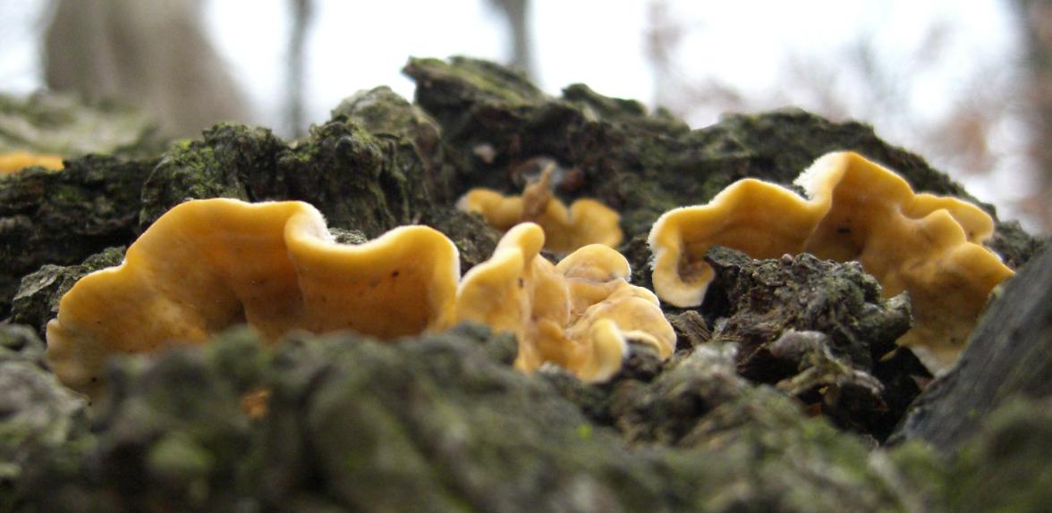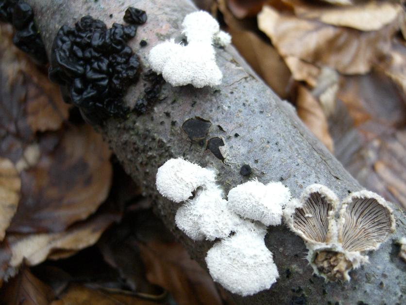 Ich vermute den Spaltblättling - Schizophyllum commune - und Warziger Drüsling - Exidia plana -