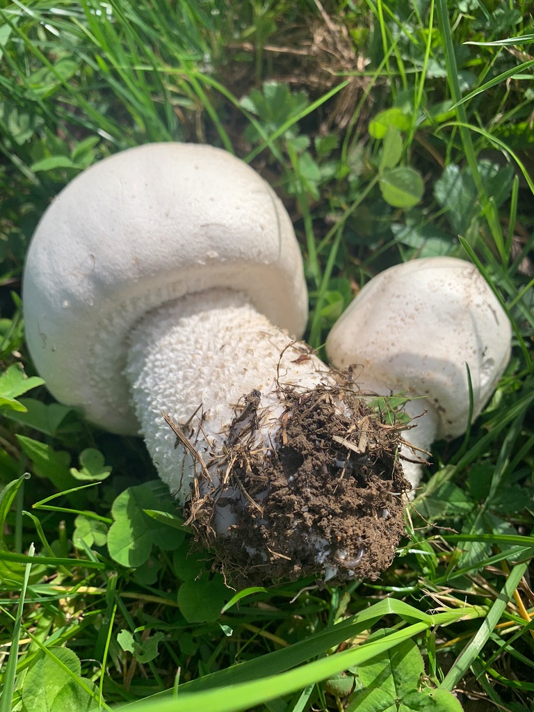 Der Großsporige Champignon wird groß. Wenn man etwas Weisses auf einer Wiese sieht, schon von weitem, kann es eigentlich nur ein Riesenbovist, eine weiße Plastiktüte, ein mit vielen Tempos abgedeckter Sch…….., oder Agaricus urinascens sein.