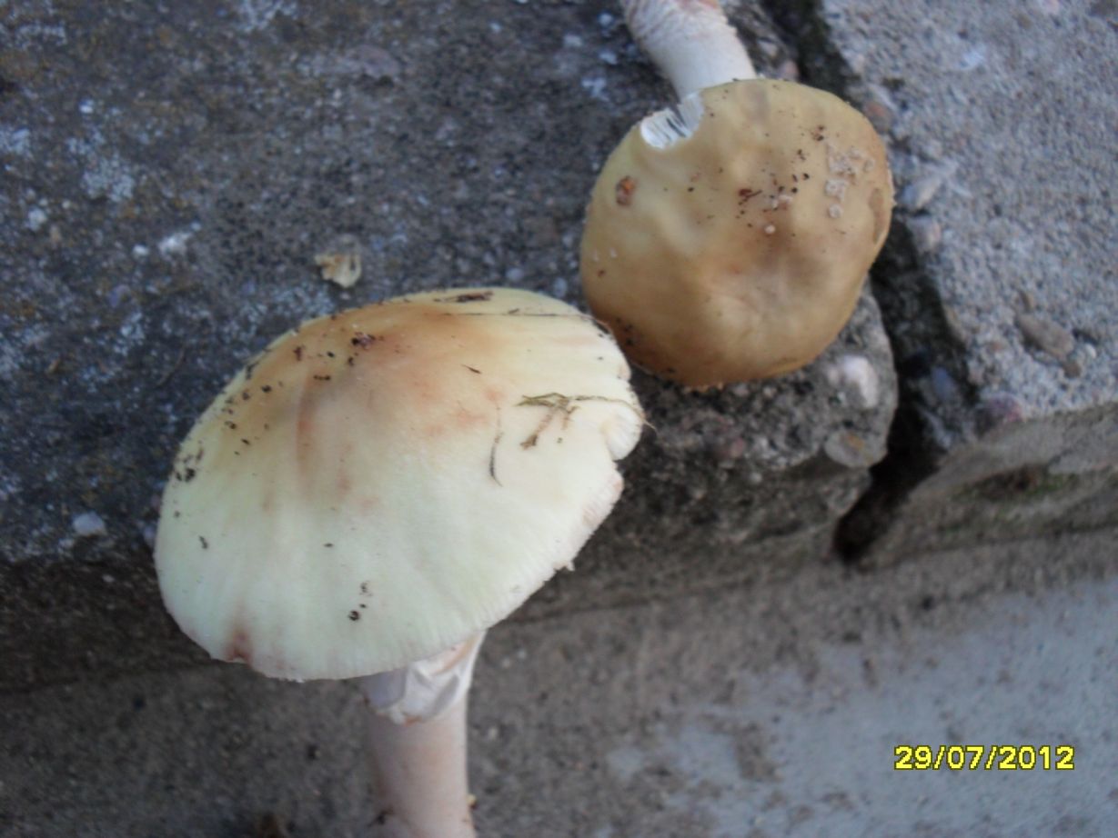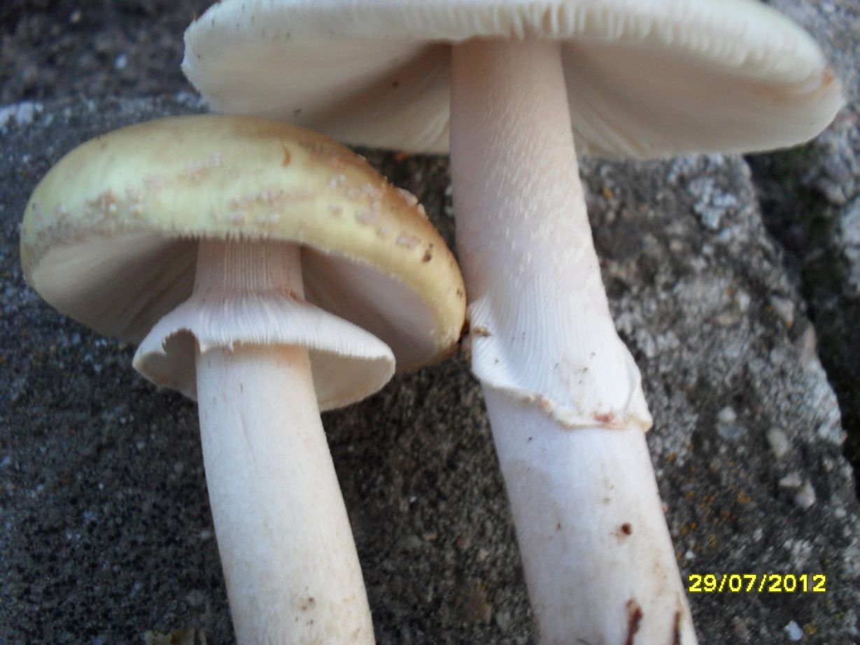 Stiel ganz leicht bräunlich, geriefte Manschette, Hut gelblich mit zum Teil Velumreste