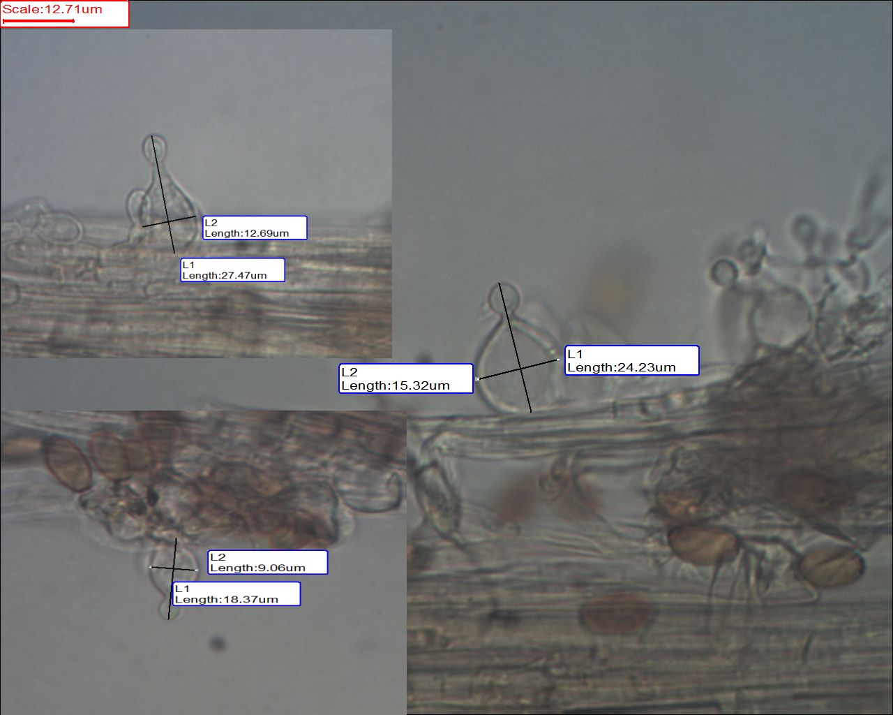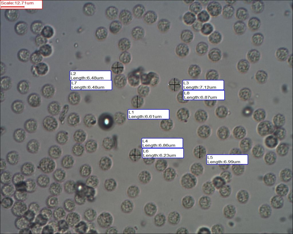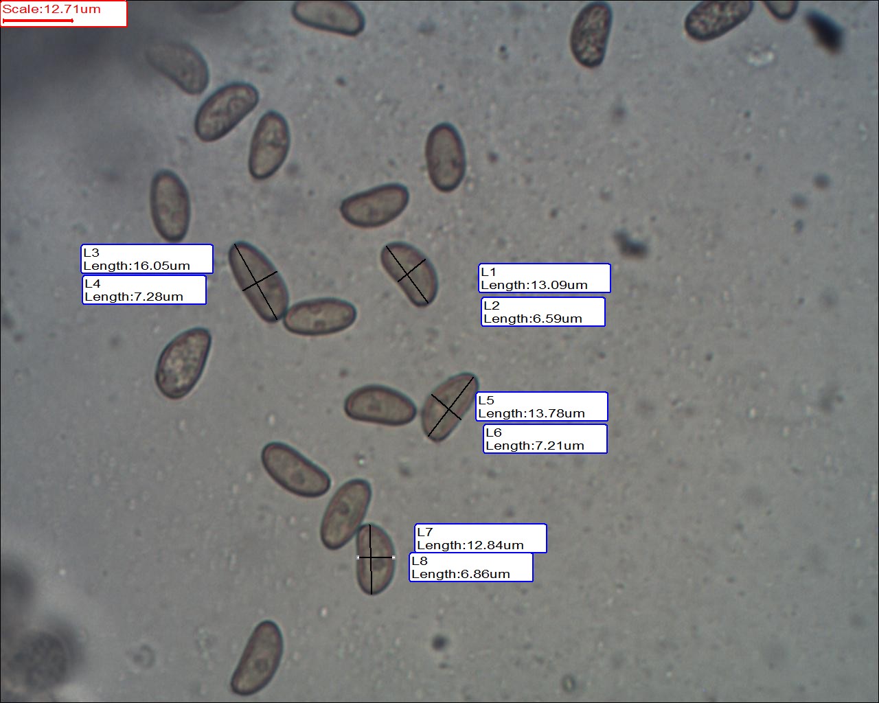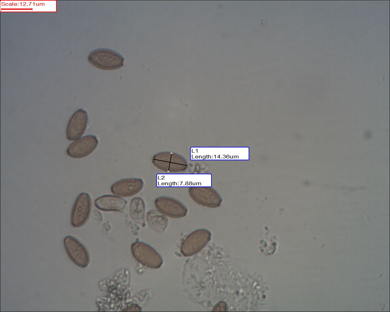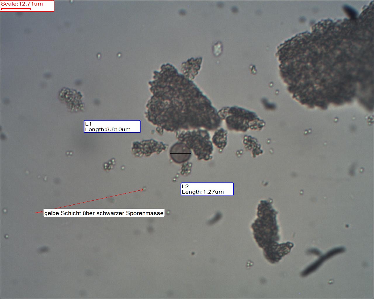 Mit der Sporengröße bin ich mir nicht so 100% sicher. Habe das Mikroskop mit Erythrozyten kallibriert.