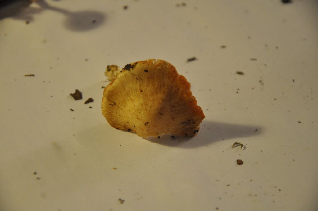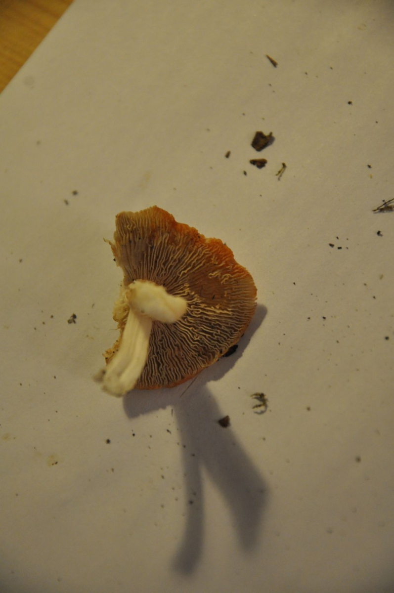 Vor allem die Unterseite ist interessant, da es sich nicht um Lamellen handelt, aber auch nicht so richtig um Poren. Wenn Poren, dann extrem länglich, fast schon Lamellen ähnlich, die oft verzweigt sind. Auf der Länge von Hutrand bis Stiel ca. 2 mal verzweigt.