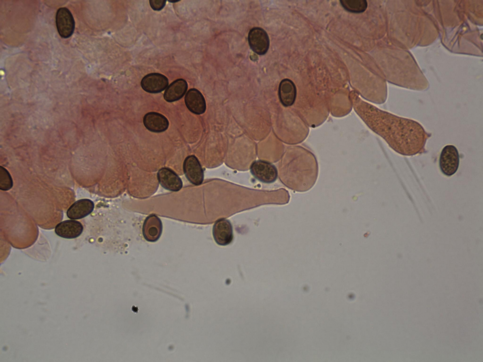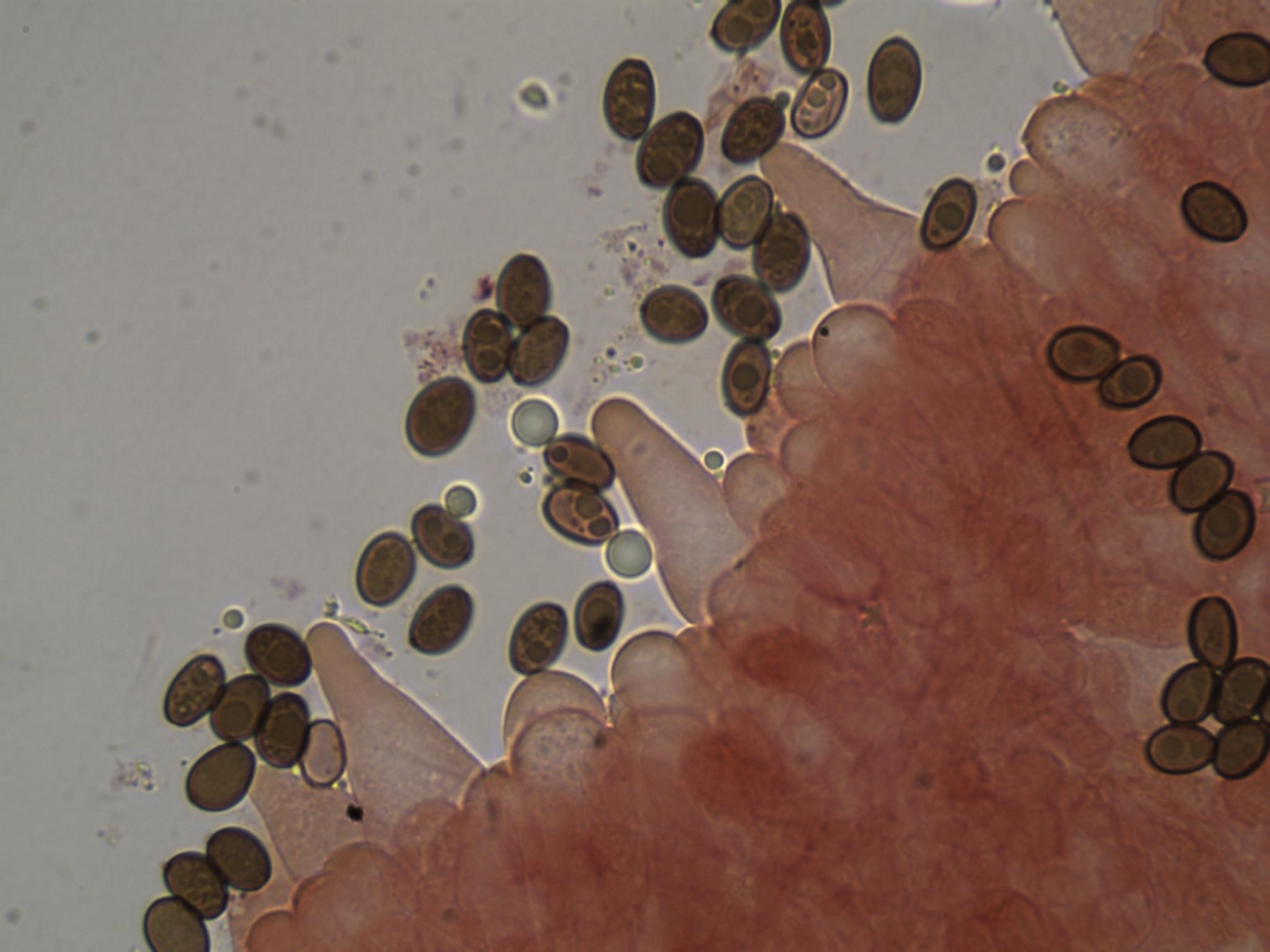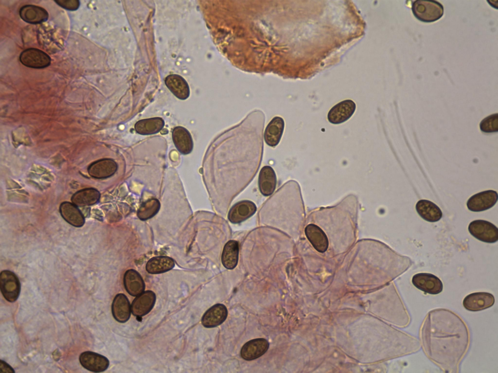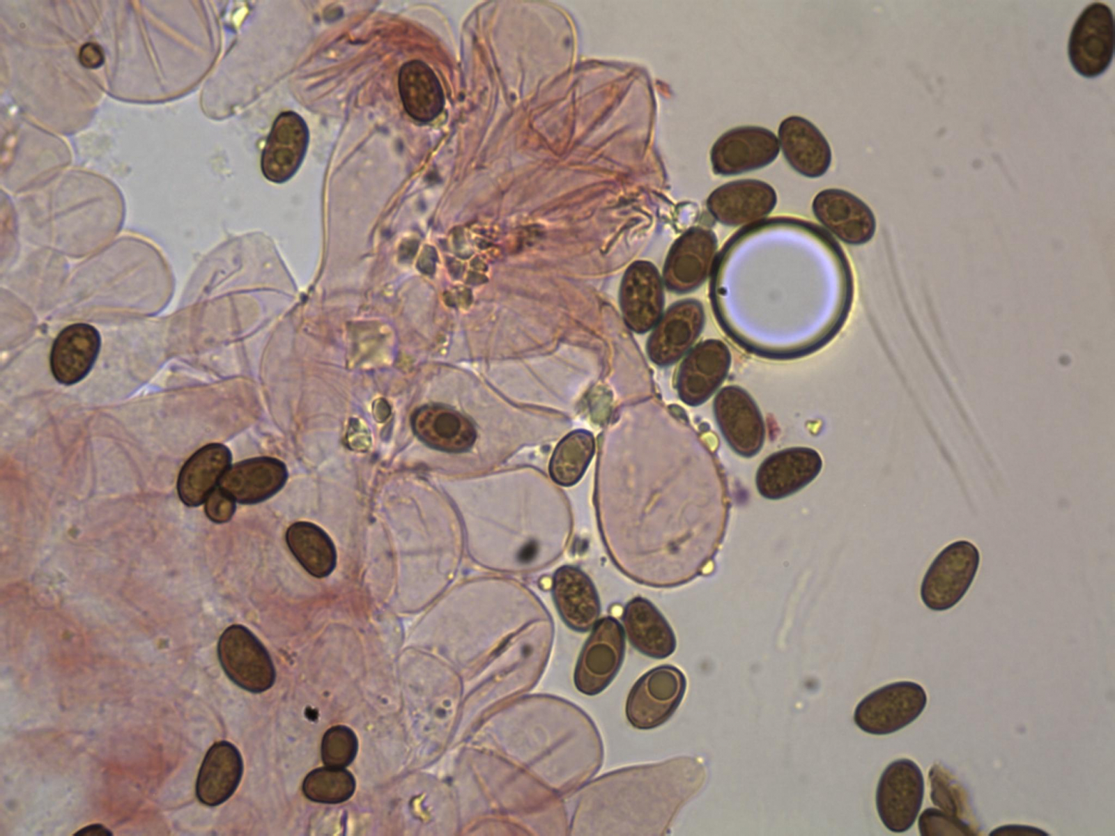 Sporen: glatt, mit Apikulus und zentralem Keinporus. Eher regelmäßig oval/eiförmig - eventuell aber auch seitlich eingedellt?