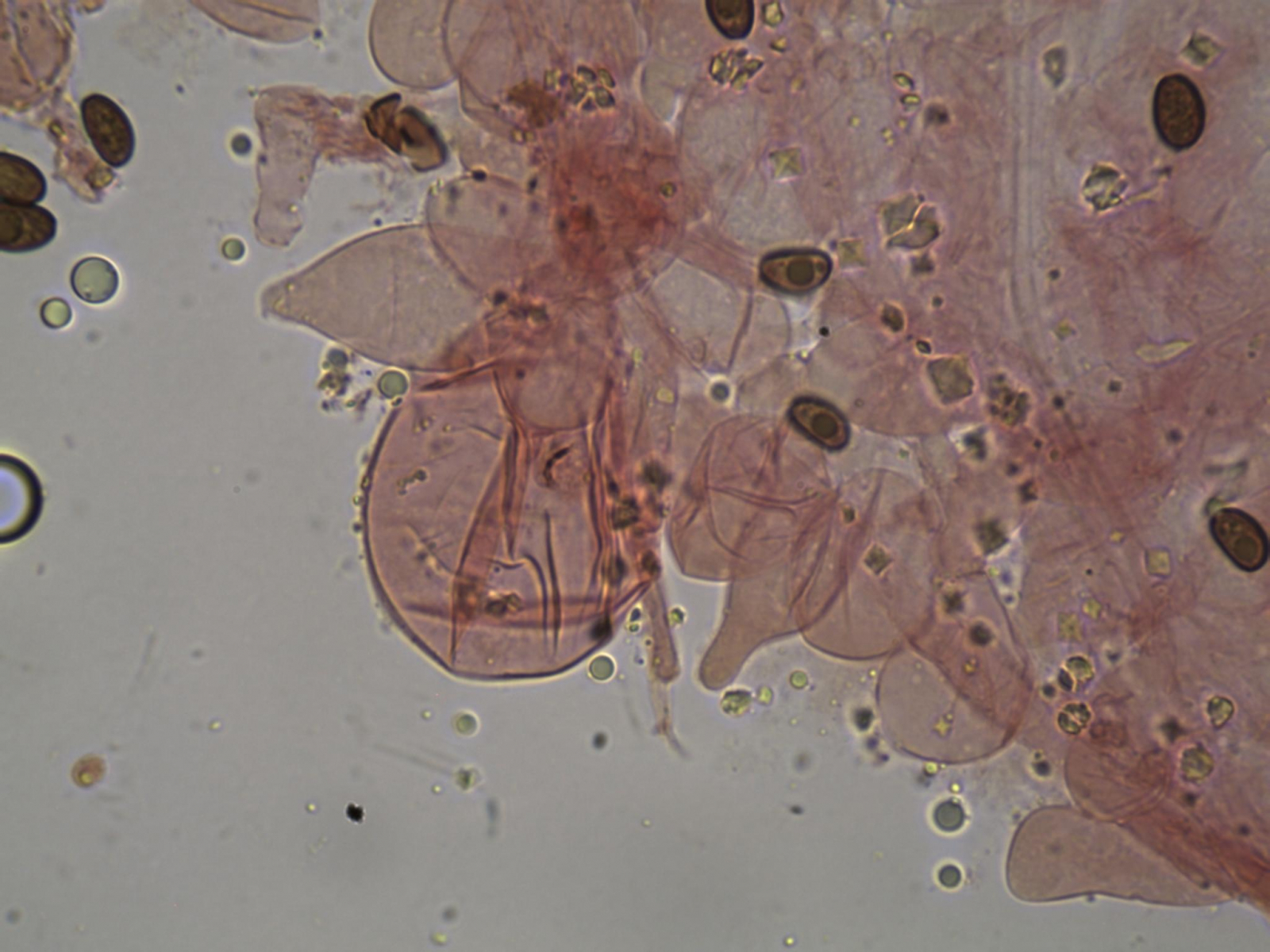 Mikroskopisch konnte ich nicht wirklich was sehen. Eventuell ein paar Sporen - bin mir aber nicht sicher.