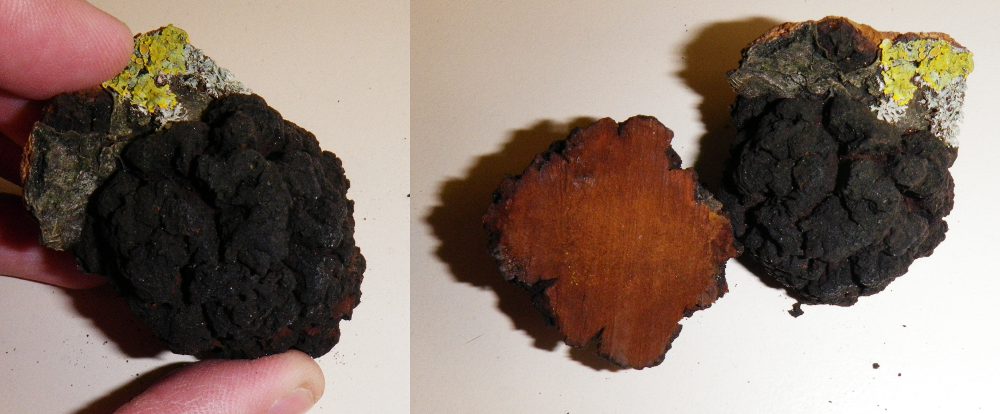 Beim Schiefen Schillerporling steht bei mir "zerbröckelnd (braunkohleartig)". So würde ich meinen Pilz hier eher nicht charakterisieren (hatte eigentlich auch schon auf Inonotus obliquus getippt).