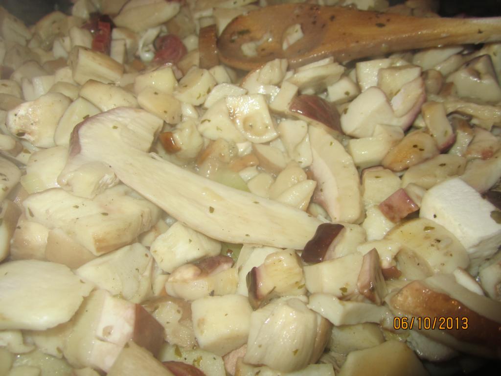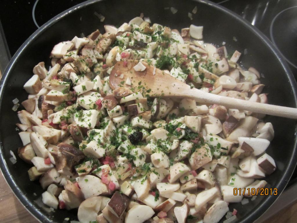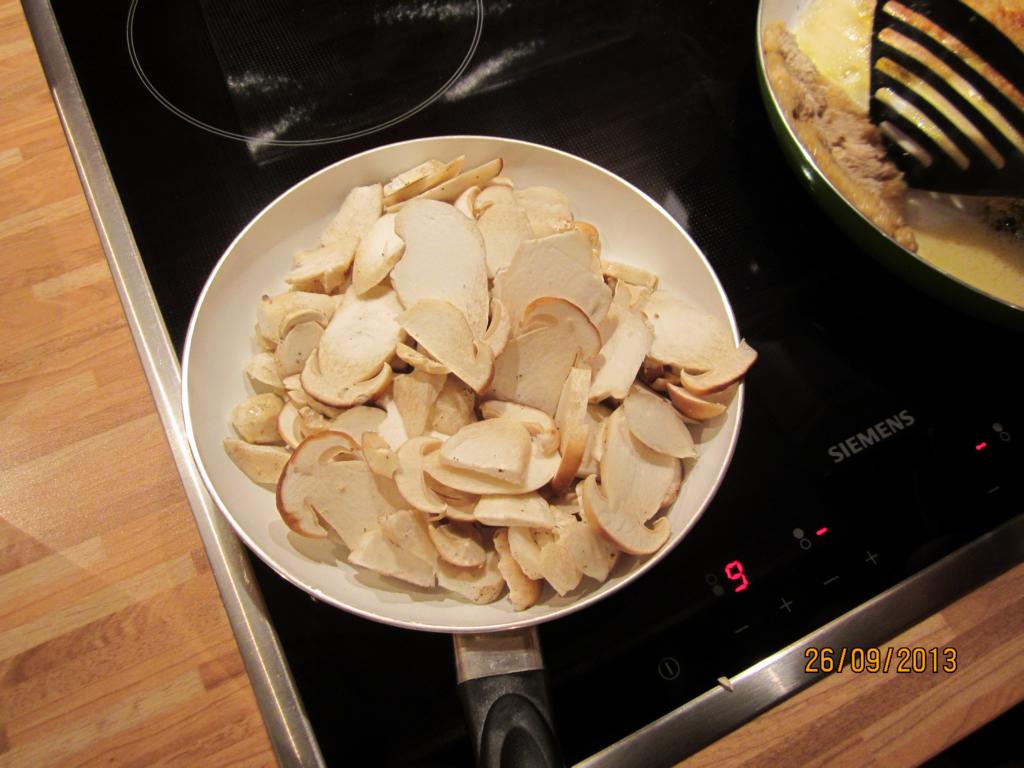 Die Röllchen nehme ich nun aus der Pfanne und lege sie alle auf einen Teller, in dem restlichen Fett brate ich zuerst die Zwiebeln und den Knobi an, dann kommen die Steinpilze dazu