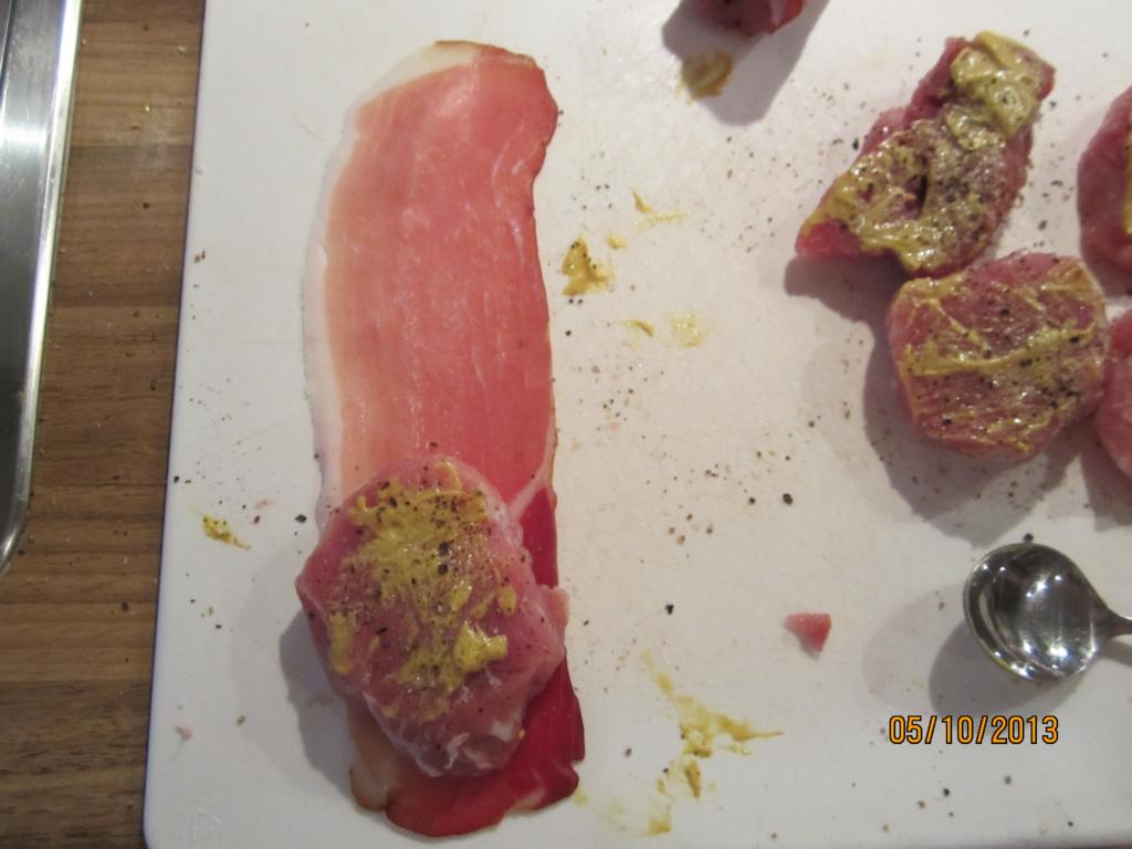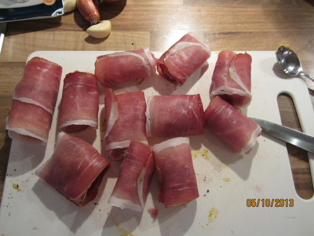 Dann die einzelnen Medaillons in Schinken einrollen