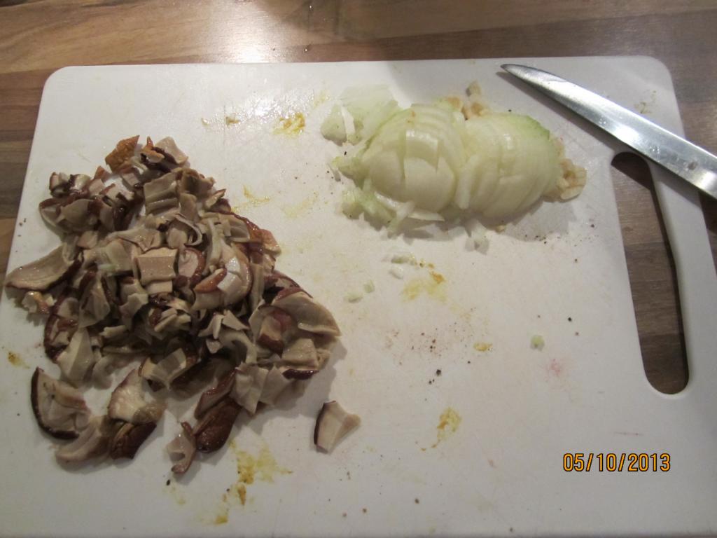 In dieser Zeit schneide ich eine Zwiebel und zwei Zehen Knoblauch, außerdem nehme ich die Steinpilze aus dem Wasser und schneide sie etwas kleiner
