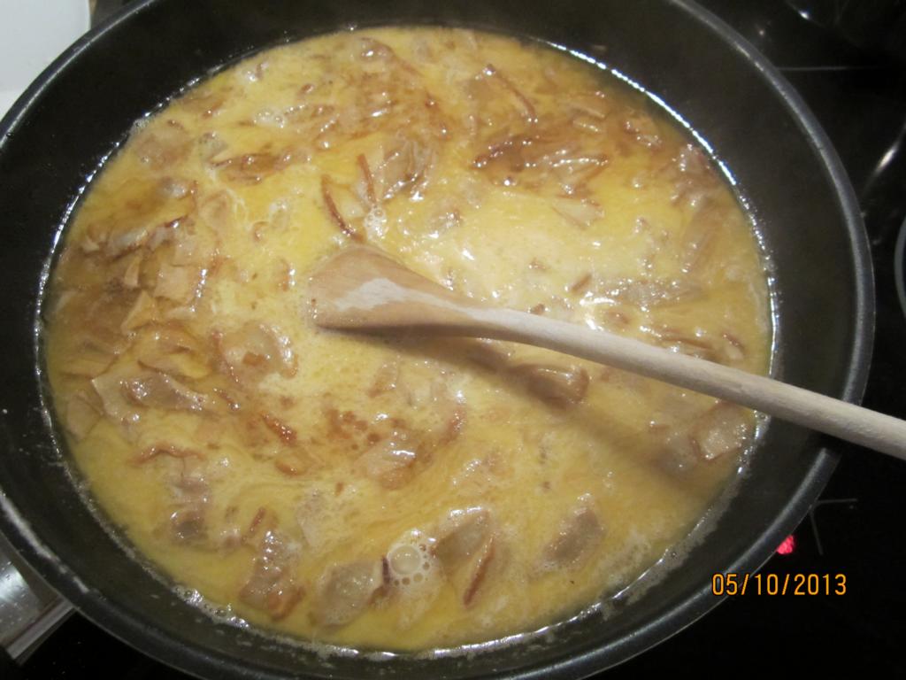 Nun kommt zu dem Ganzen ein Becher Sahne, sowie das Einweichwasser der Steinpilze.