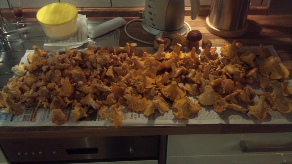 Da ich morgen nach Kroatien fahre, wollte ich heute unbedingt nochmal in den Wald. Es hat zwar geregnet und ich bin jetzt pitsch nass, aber es hat sich gelohnt! Insgesamt sind es 3,1kg Pfifferlinge, darunter 4 kleinere Steinis. Naja, seht selbst ![]()