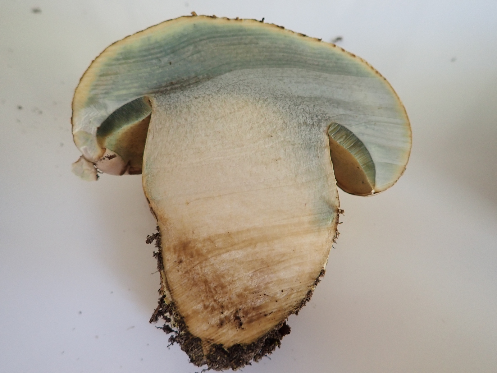 Beide zeigen ein vergängliches (10-15 min.) Blauen im Hutfleisch; das ältere Exemplar zeigt zudem eine Rotfärbung im Stiel ...: