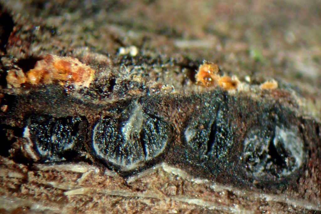 Grüppchen von meist 5-15 Fruchtkörpern an den Ostiolen der Massaria sitzt.