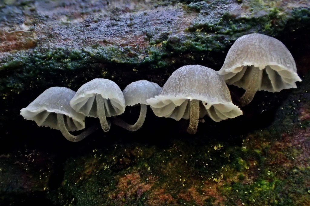 Hier nun der erste von ihnen, der möglicherweise auf den Namen Geriefter Rindenhelmling (Mycena cf. mirata) hört.