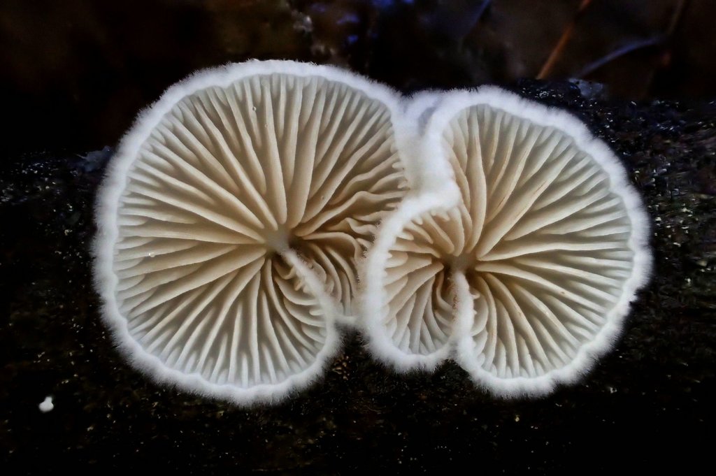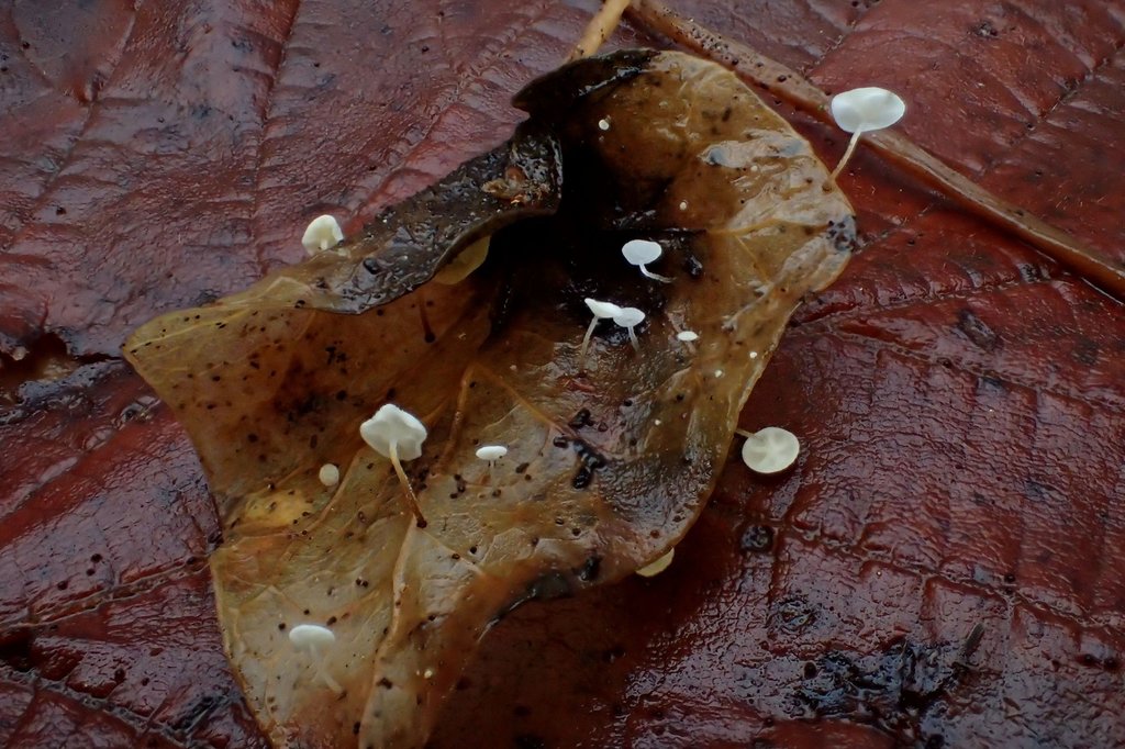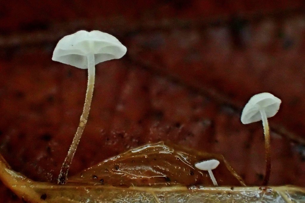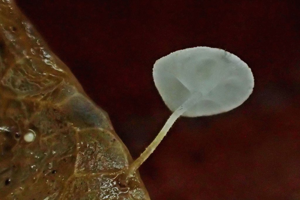 Höhepunkt für mich war allerdings ein noch winzigeres Pilzchen, das zu Hunderten an verrottenden Efeublättern wuchs. Es handelt sich um den von mir seit Jahrzehnten vergeblich gesuchten Efeu-Schwindling (Marasmius epiphylloides). Fotografisch für mich nahezu unlösbar (weiß, winzig, zerbrechlich!) habe ich versucht, das Beste daraus zu machen. Nicht optimal gelungen, aber zumindest vorzeigbar.