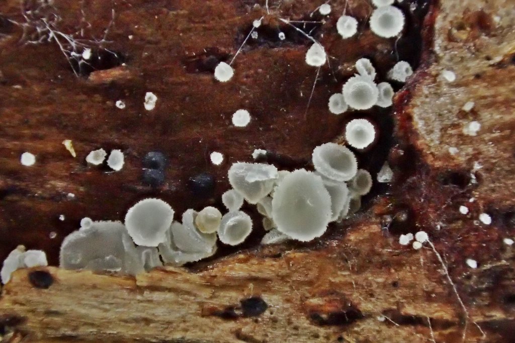 Winzige Haarbecherchen und Pyrenos an einem Fichtenzapfen.