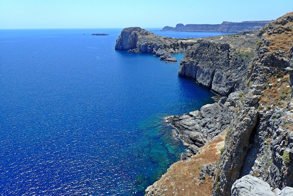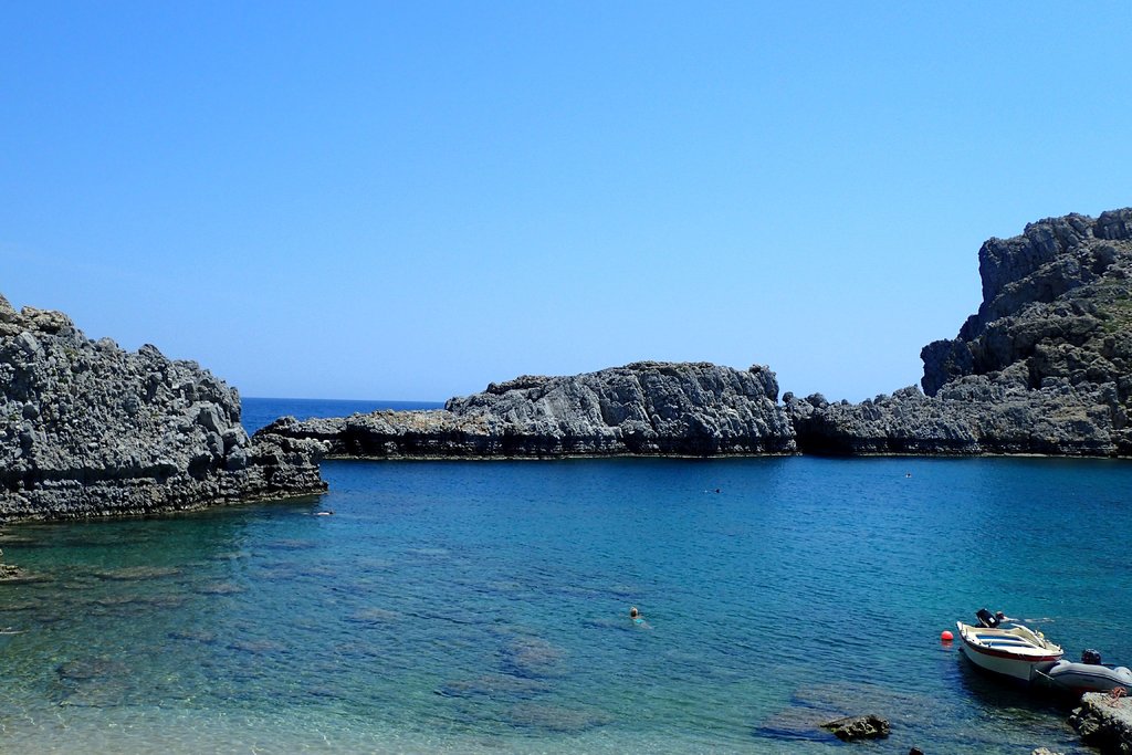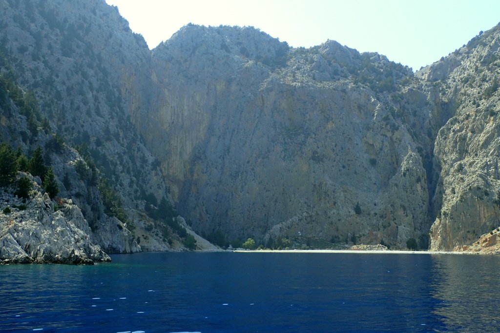 Satt und zufrieden steuerten wir noch eine letzte, spektakuläre Badebucht an, die von 300 m hohen Klippen umgebene Felsenbucht des Heiligen Georgs (Agios Georgius).