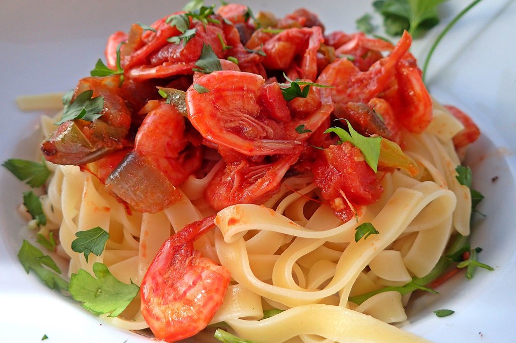 Eine weitere Leckerei sind die roten symischen Garnelen, die man meist mit Nudeln serviert bekommt und komplett mit dem zarten Panzer essen kann.