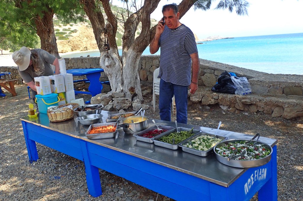 Eine handgeschriebene Tafel, wo sechs griechische Spezialitäten für zwei bis drei Personen zum Preis von 25 Euro angeboten wurden, zog uns magisch an.