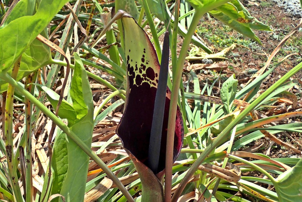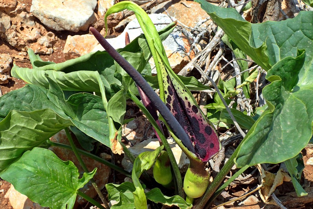 Einige Pflanzen des hübschen Griechischen Arostabes (Arum dioscoridis) konnte ich zwischen Steinen und Kötteln entdecken.