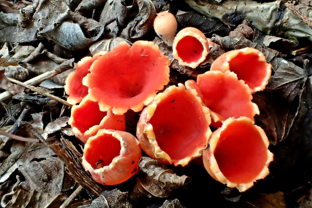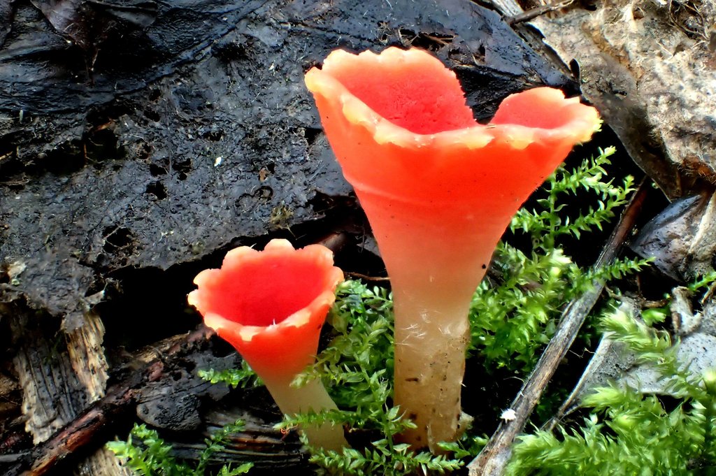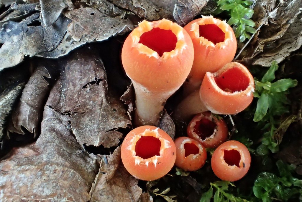 Dieses Mal die leuchtenden, die orangeroten. Tulpenbecherlinge (Microstoma potractum).
