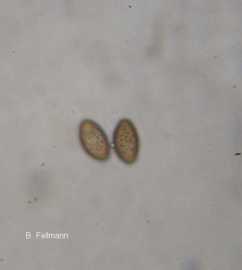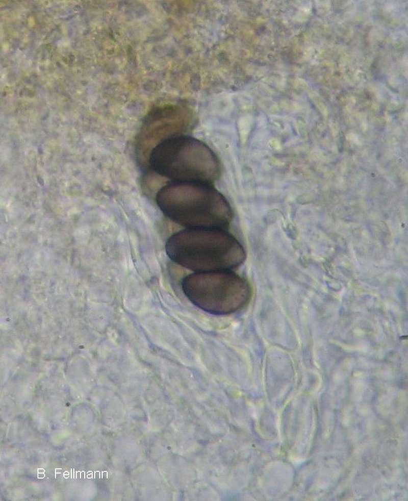 Einzelsporen: 14-15 x 8 µ, ungleichseitig elliptisch/spindelig, erst hyalin, dann violett später dunkelbraun, mit isoliert-warzigem Ornament.