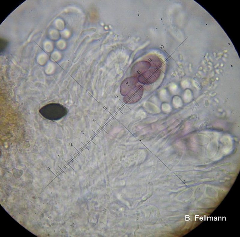 Asci: 70-90 x 20 µ, IKI +, Wände verfärben sich deutlich blau, apikal keine Reaktion, Paraphysen rotbraun.