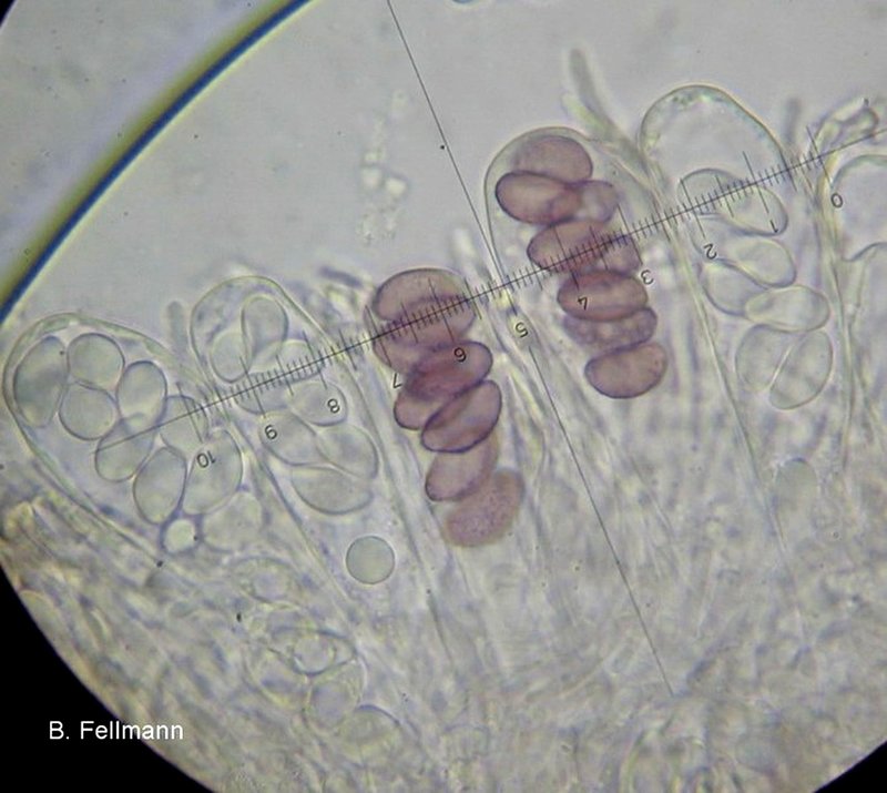 Die Möglichkeit, dass es sich um einige fehlentwickelte Asci handelt, konnte Bernd meiner Meinung nach widerlegen, indem er mir mitteilte, dass er drei weitere Apothecien mit der gleichen Sporengröße und Sporenanordnung mikroskopiert hat.