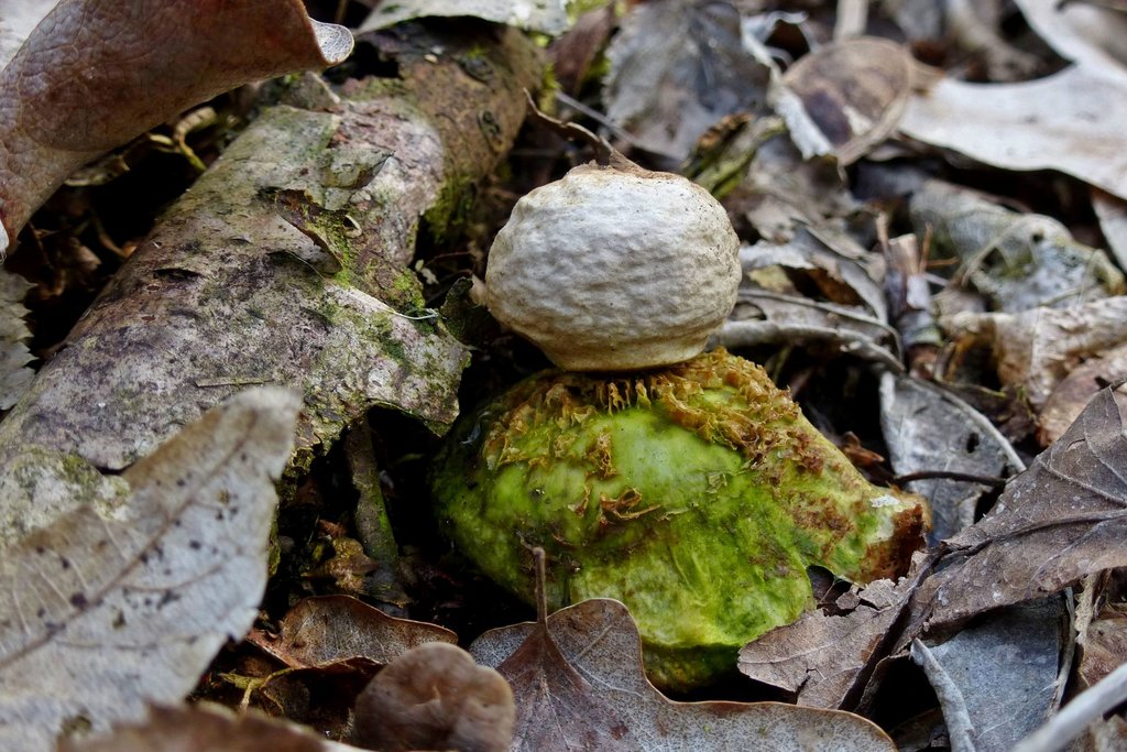 Eine Rarität ist der Grüne Halskrausen-Erdstern (Geastrum triplex var. viride), eine Art des Frühlings, die zwingend einer Überwinterung bedarf.