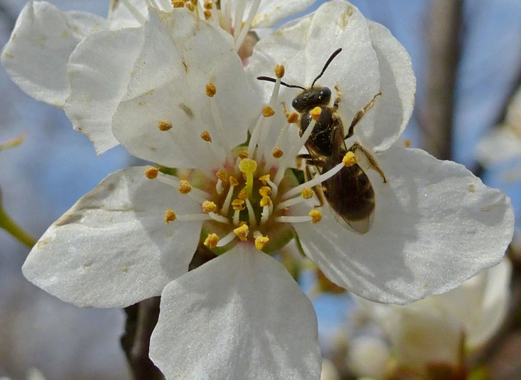 Diese Blüte hatte einen Gast. Vermutlich eine Furchenbiene (Lasioglossum spec.), wie ich soeben dank des Naturforums.eu erfuhr.