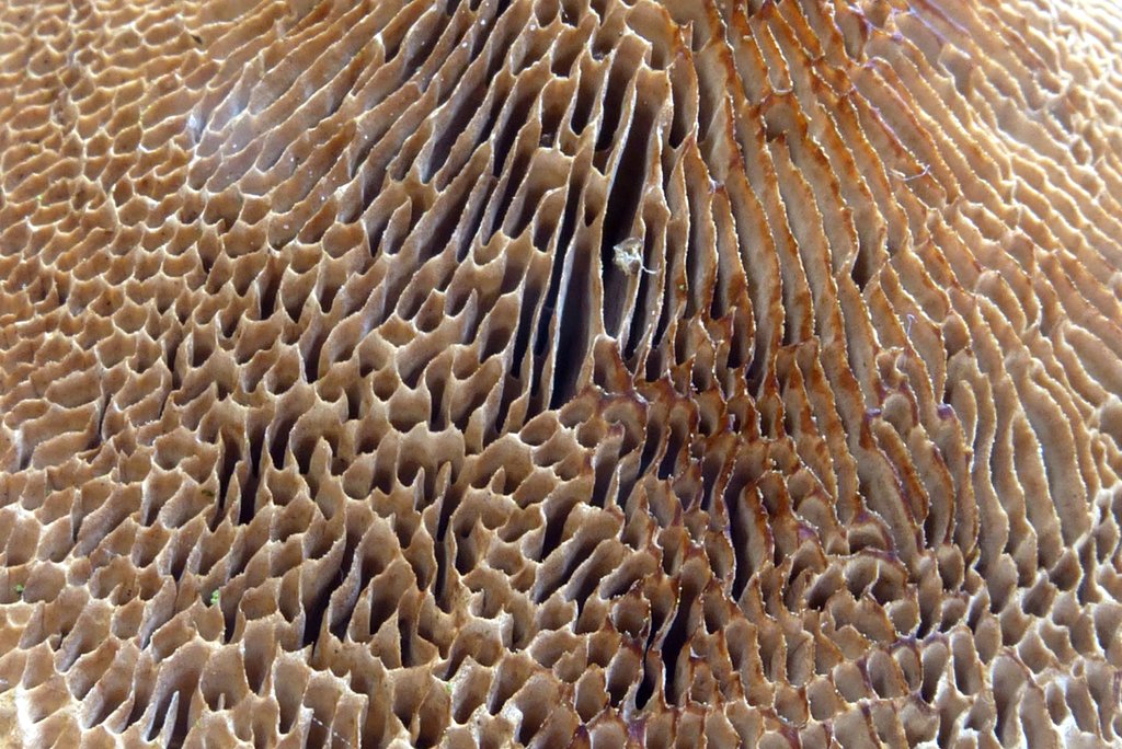 Ein weiterer Pilz an Holz. Rötende Tramete (Daedaleopsis confragosa, Blick aufs Hymenophor).