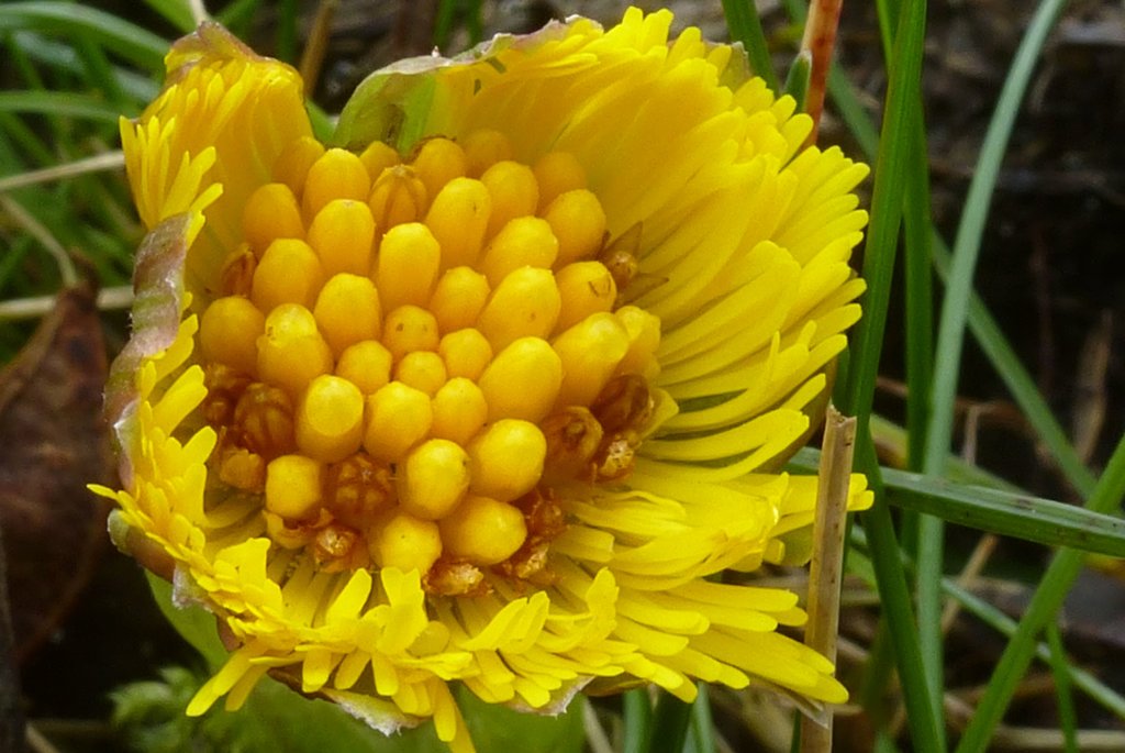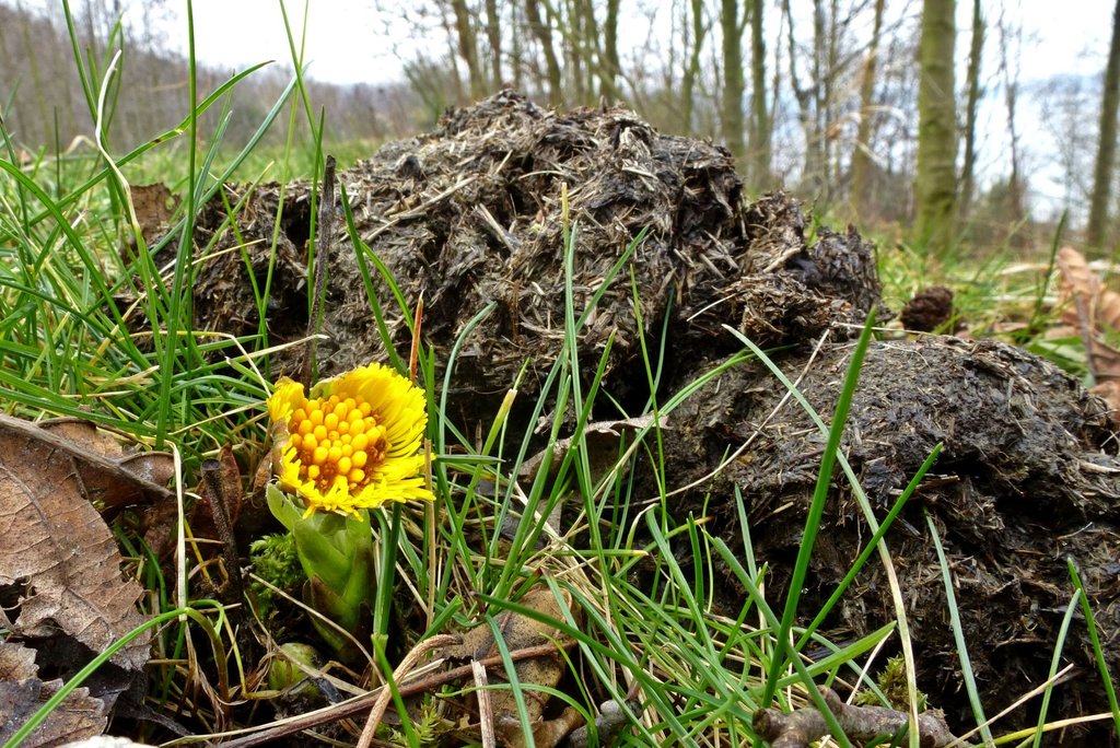 Einen Hauch Frühling und etwas Farbe in den Tag brachte dann noch eine im Schutze eines Dunghaufens neugierig in die Welt schauende Huflattichblüte.