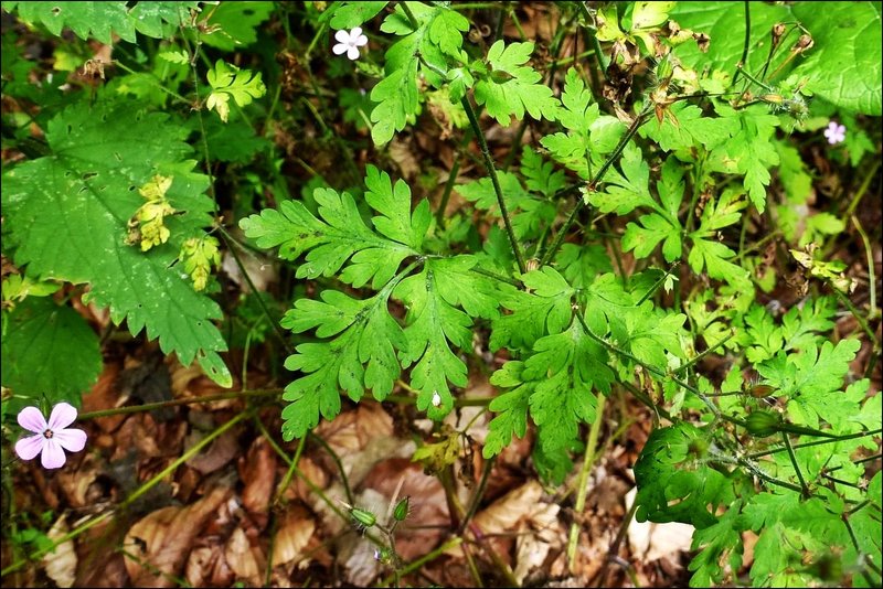 Bereits am Parkplatz fielen mir schwarzpunktierte Blätter des Ruprechtskrautes (Geranium robertianum) auf.