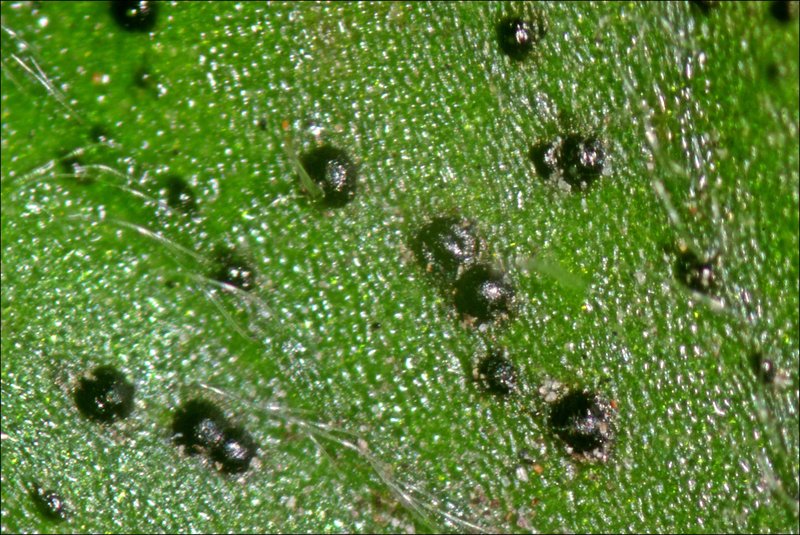 Bei den schwarzen Punkten handelt es sich um die Perithecien (Fruchtkörper) von Coleroa robertiani (Ruprechtskraut-Kugelpilz).
