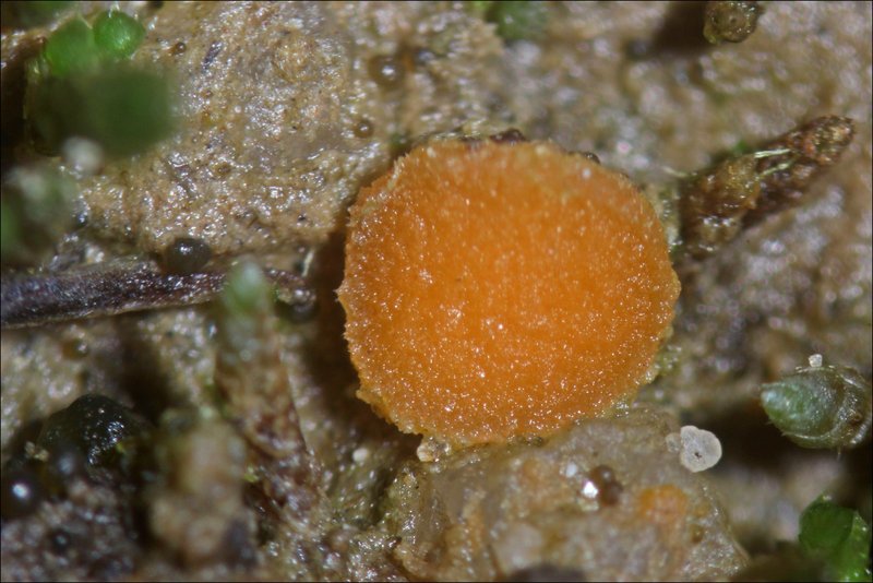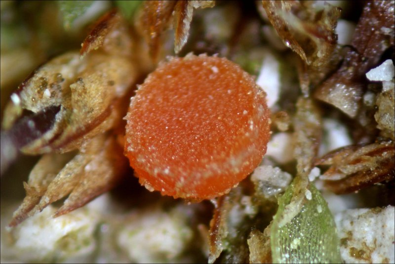 Dieser hört auf den Namen Octospora leucoloma, hat glatte elliptische Sporen und parasitiert auf dem Silbermoos Bryum argenteum.