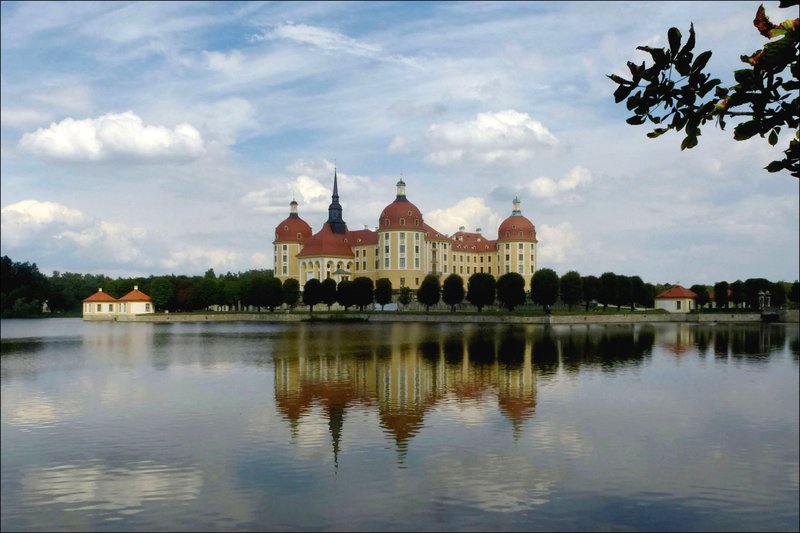 Das inmitten des Schlossteiches gelegene Schloss Moritzburg entstand im 18. Jh. unter August dem Starken aus einem Jagdhaus, welches Moritz von Sachsen (Name!) bereits im 16. Jh. erbauen ließ. Es ist eines der schönsten sächsischen Schlösser und diente u.a. dem bezaubernden Märchenfilm –žDrei Haselnüsse für Aschenbrödel–œ als Kulisse.