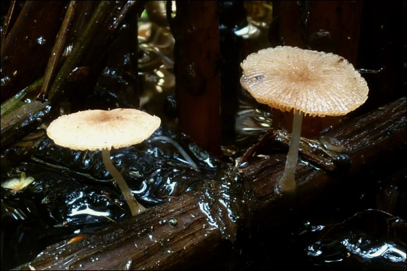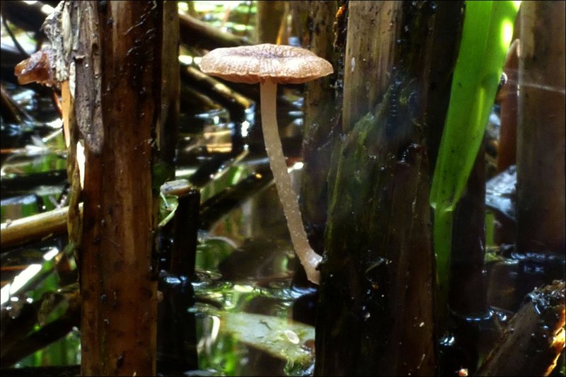 Erebus hat ihn ja schon gezeigt, den Sumpfpflanzen-Mürbling (Psathyrella typhae). Ein kleiner, unscheinbarer Pilz, der sich an stehenden und liegenden Stängeln des Rohrkolbens (Typha spec.) kurz über der Wasseroberfläche wohlzufühlen schien.
