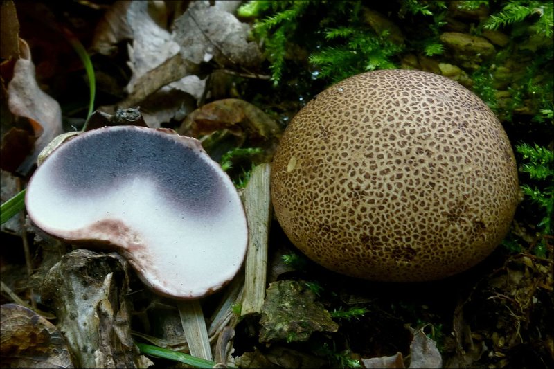 Pilz 06 ist trotz Leopardenfell –žnur–œ ein Dünnschaliger Kartoffelbovist (Scleroderma verrucosum), was mikroskopisch durch die feinstachligen Sporen leicht festzustellen war.