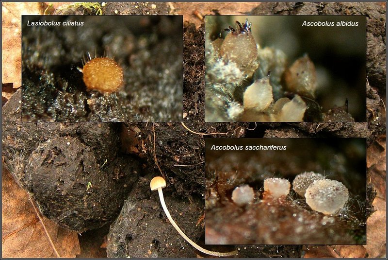 Gewöhnlich entwickeln sich als Nächstes kleine Dungbecherlinge, wobei einige voreilige Pyrenomyceten bereits ihre Hälse aus dem Substrat recken. Doch bleiben wir noch kurz bei den Becherchen. Da gibt es solche, die stolz ihre Wehrhaftigkeit demonstrieren, wie Lasiobolus ciliatus, oder solche, wo das Violett der reifen Sporen bereits durch die Schläuche schimmert, wie bei den beiden hier zu sehenden Ascobolus-Arten.