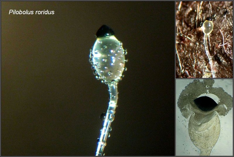 Der gefundene Pilobolus gehört zu einer selteneren Art der Gattung. Seine kleinen blassen Sporen von gerade einmal 5 x 3 µm und das winzige Sporangium von etwa 200 µm Durchmesser verraten uns schließlich seinen Namen: Pilobolus roridus